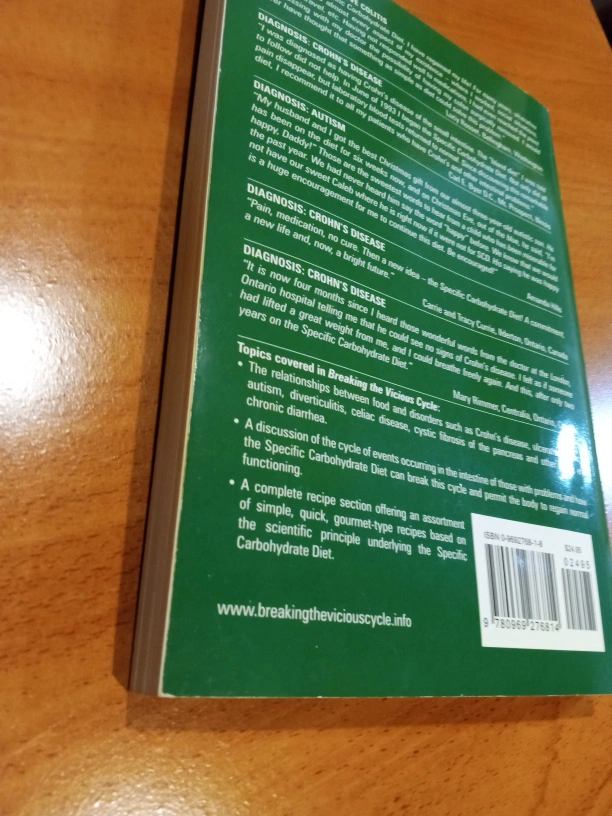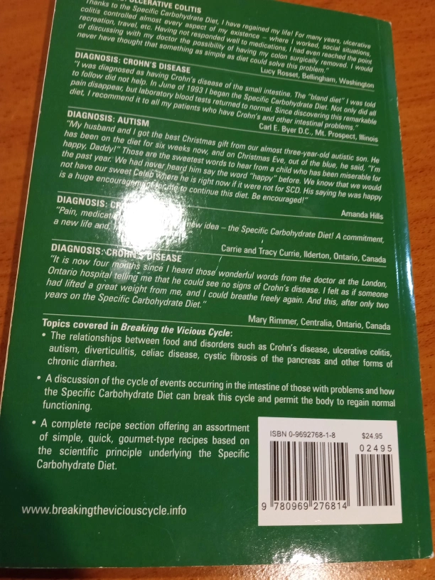 42Paperback book. Diet for Crohn's disease, ulcerative colitis, diverticulitis, celiac disease, cystic fibrosis, and chronic diarrhea. Includes the "Autism Connection".