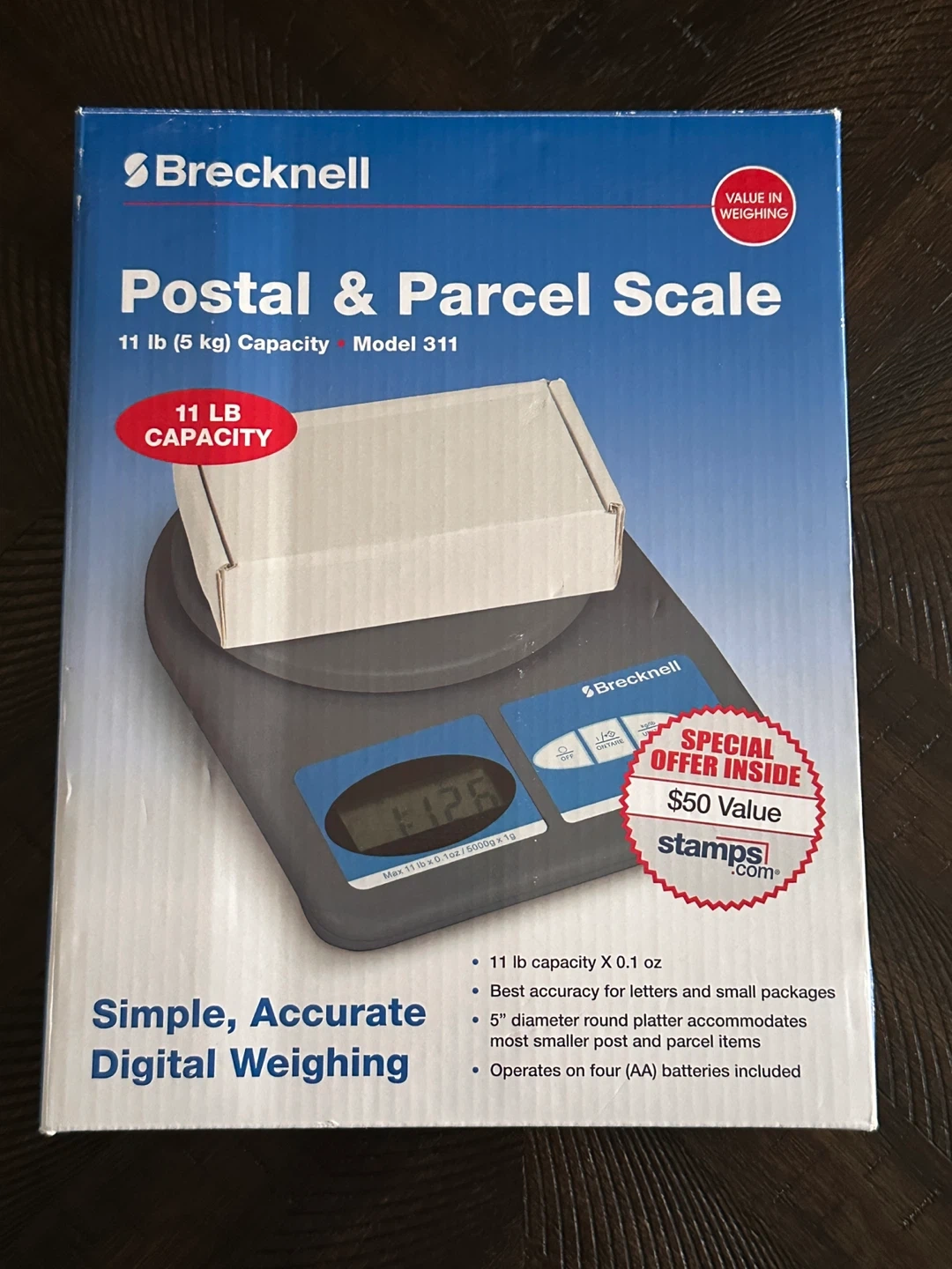 65Selling a Brecknell Postal & Parcel Scale, model 311. It has an 11 lb (5 kg) capacity and is perfect for weighing letters and small packages. The scale features a 5" diameter round platter and operates on four (AA) batteries. The box is included!