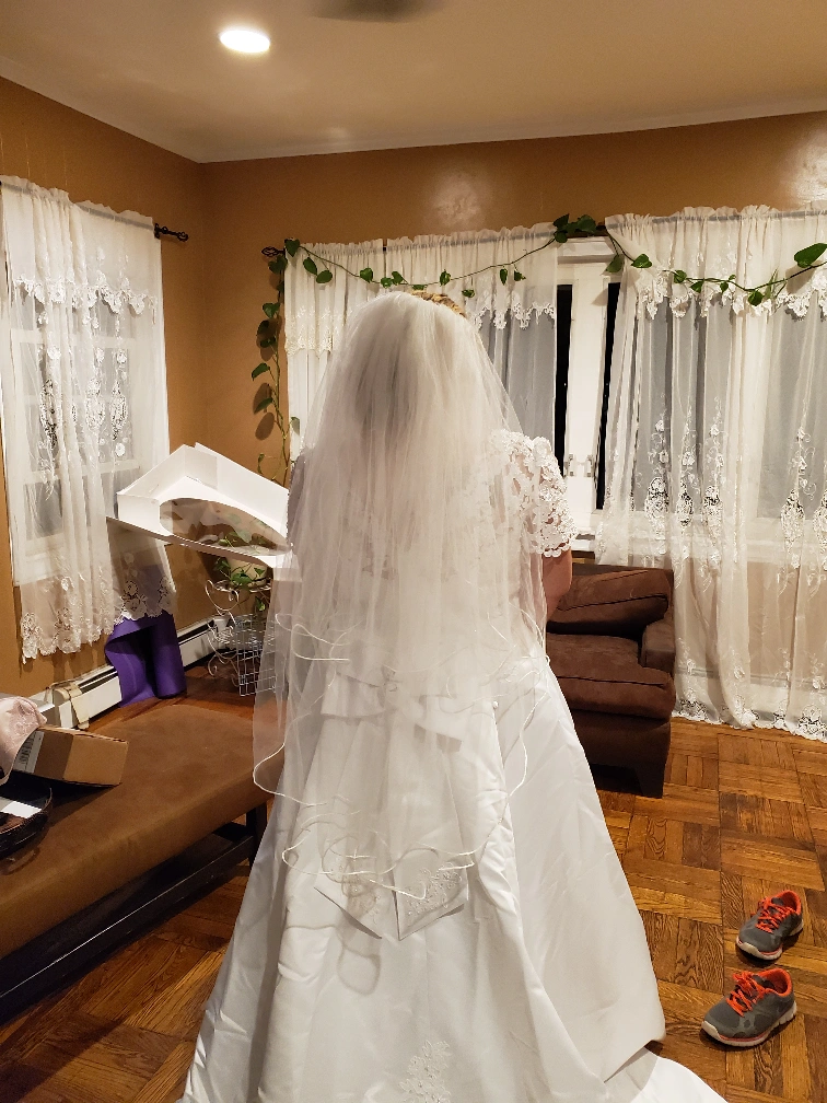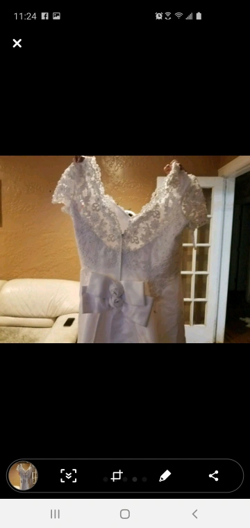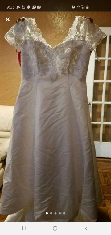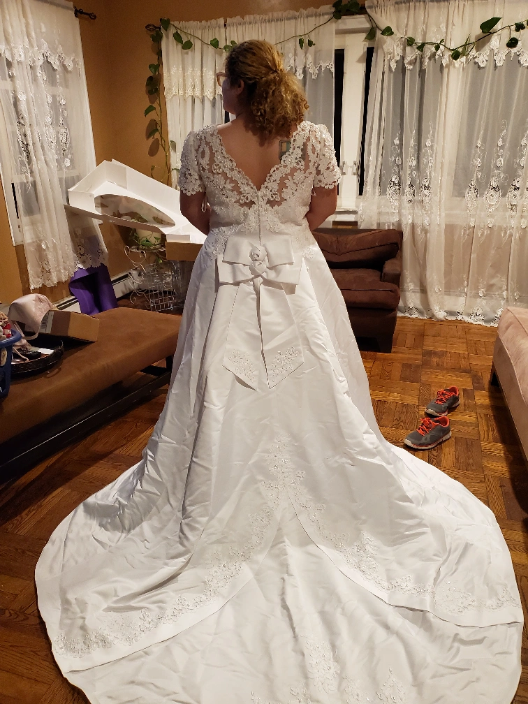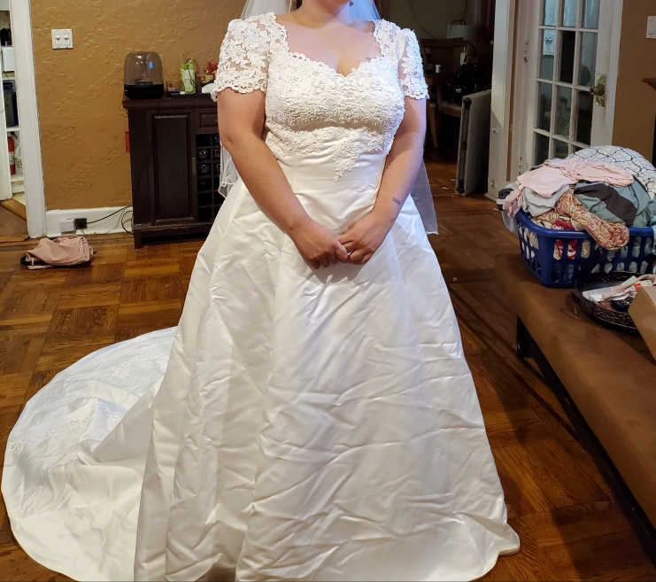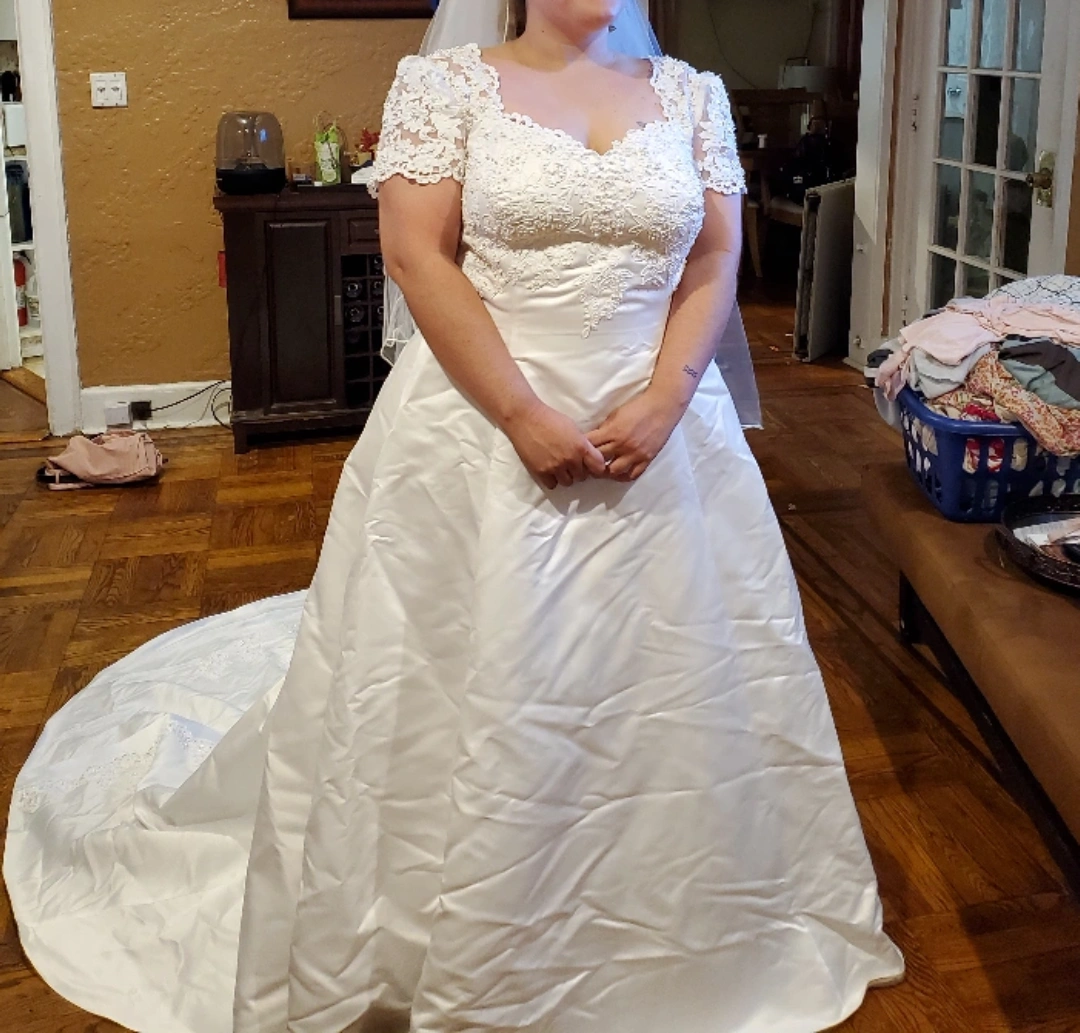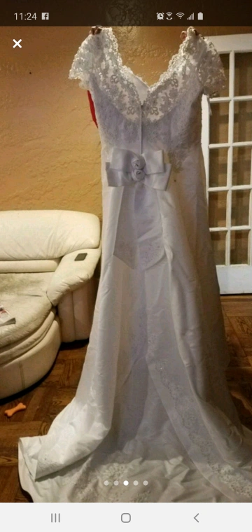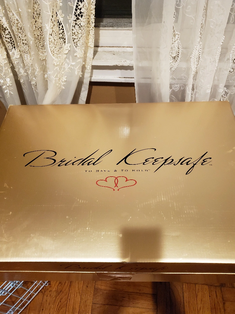 Selling a beautiful wedding dress that has been carefully preserved in a Bridal Keepsake box. The dress features delicate lace detailing and a classic design. It comes with the original box for safekeeping.