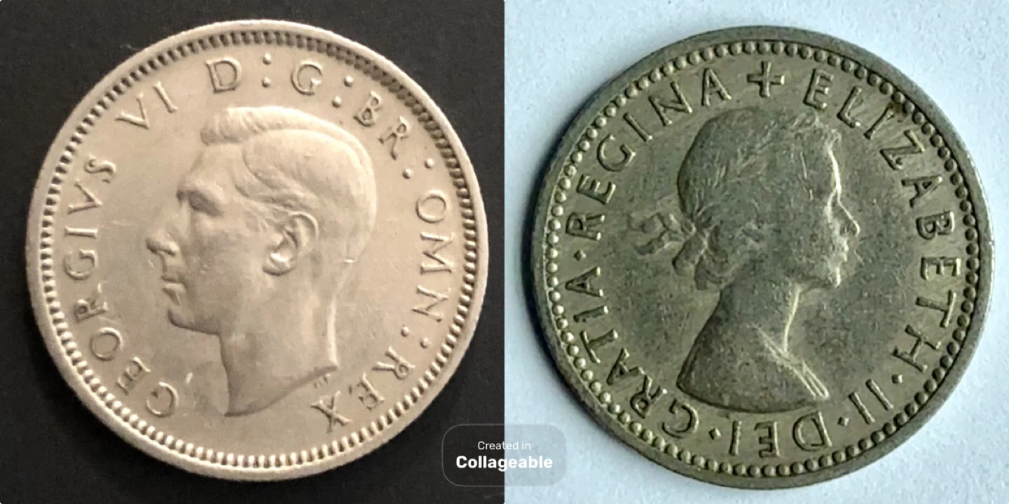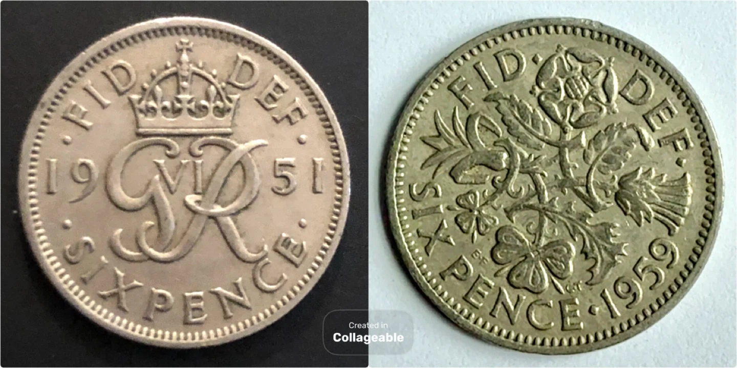 130BRIDE & GROOM GREAT BRITAIN SIXPENCES - QUEEN ELIZABETH II & GEORGE VI Perfect little gift to a bride and groom for use on their wedding day! No time to meet up? I can mail these sixpences (with tracked shipping) out for $14.50 total with a PayPal or Venmo payment. Both sixpences are in very good condition - the dates may differ from the ones pictured. The Queen Elizabeth II sixpence has her profile on the obverse, and the botanical symbols for Britain (rose), Scotland (thistle), Northern Ireland (shamrock), and Wales (leek) on the reverse. The King George VI sixpence features the profile of King George VI, Queen Elizabeth’s father (the one featured in the movie “The King’s Speech”). It has his initials and the date on the reverse. These sixpences are not silver, no silver sixpences were made after 1946.
