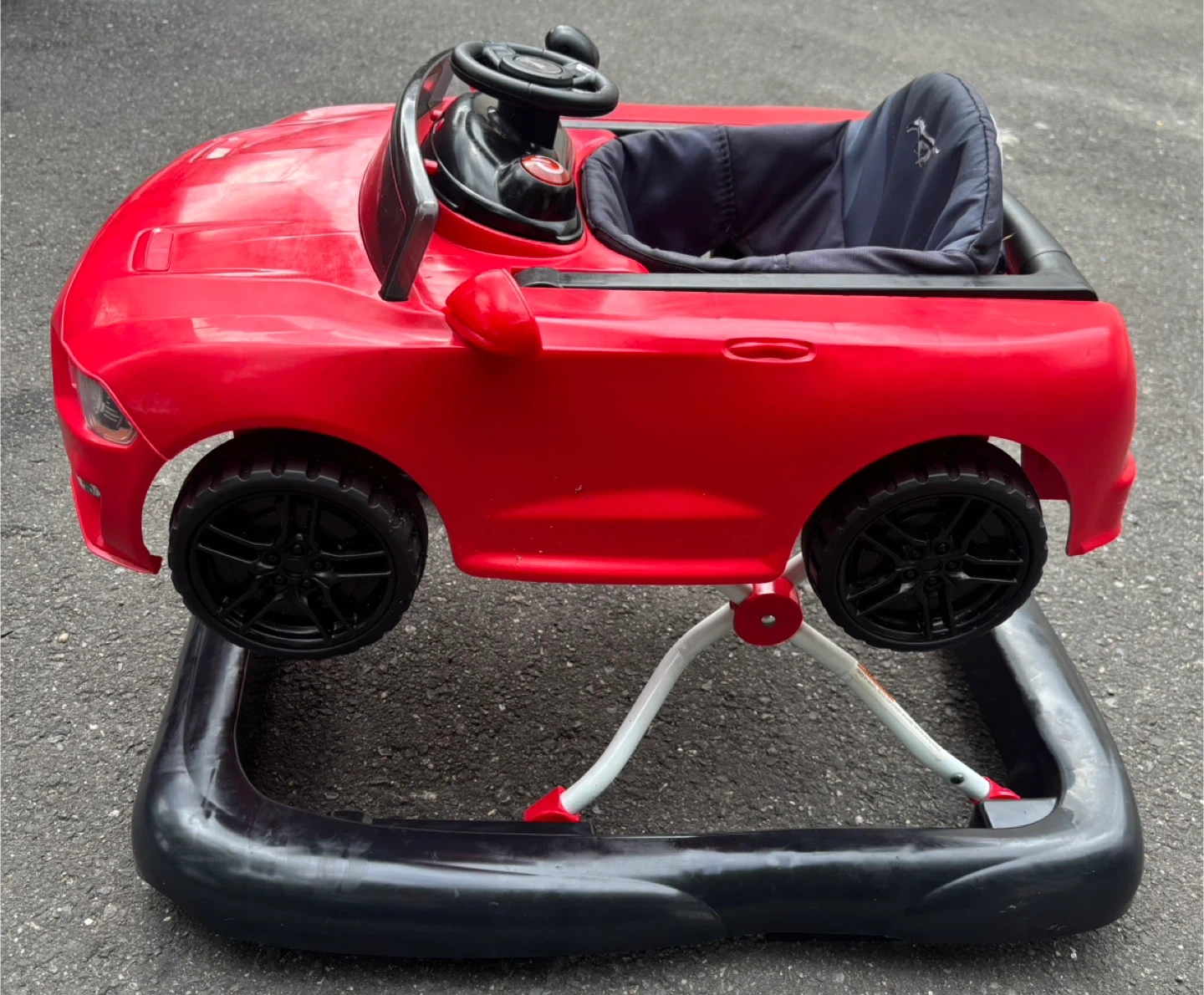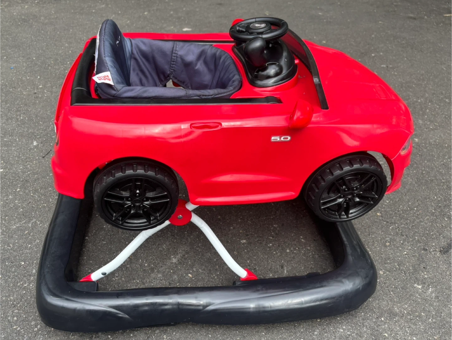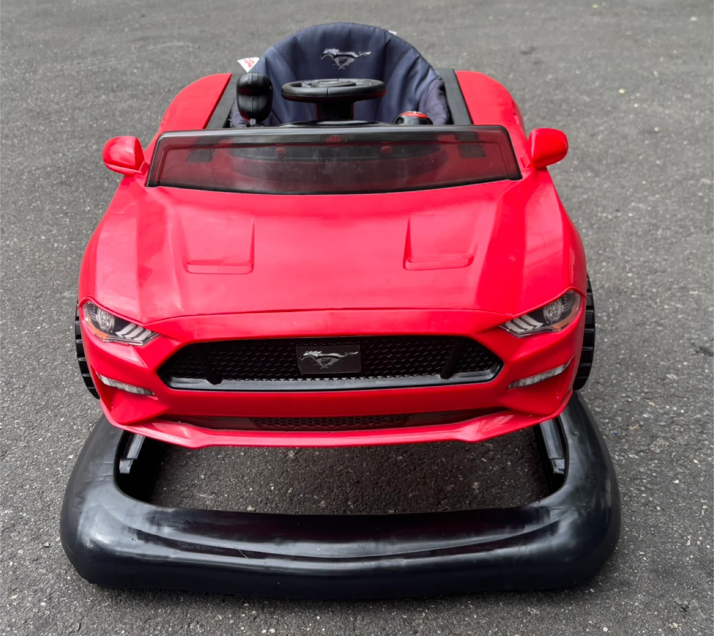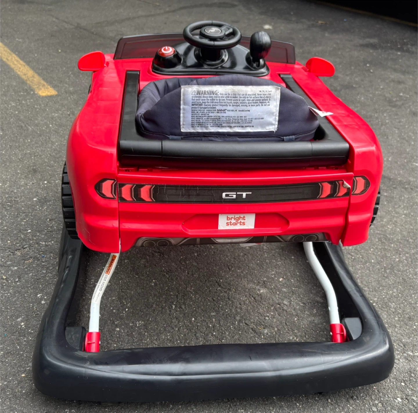 Here's a Bright Starts Ford Mustang baby walker in red! It's in great condition and ready for a new little driver. The walker is designed to look like a Ford Mustang GT, adding a fun touch to your baby's playtime.