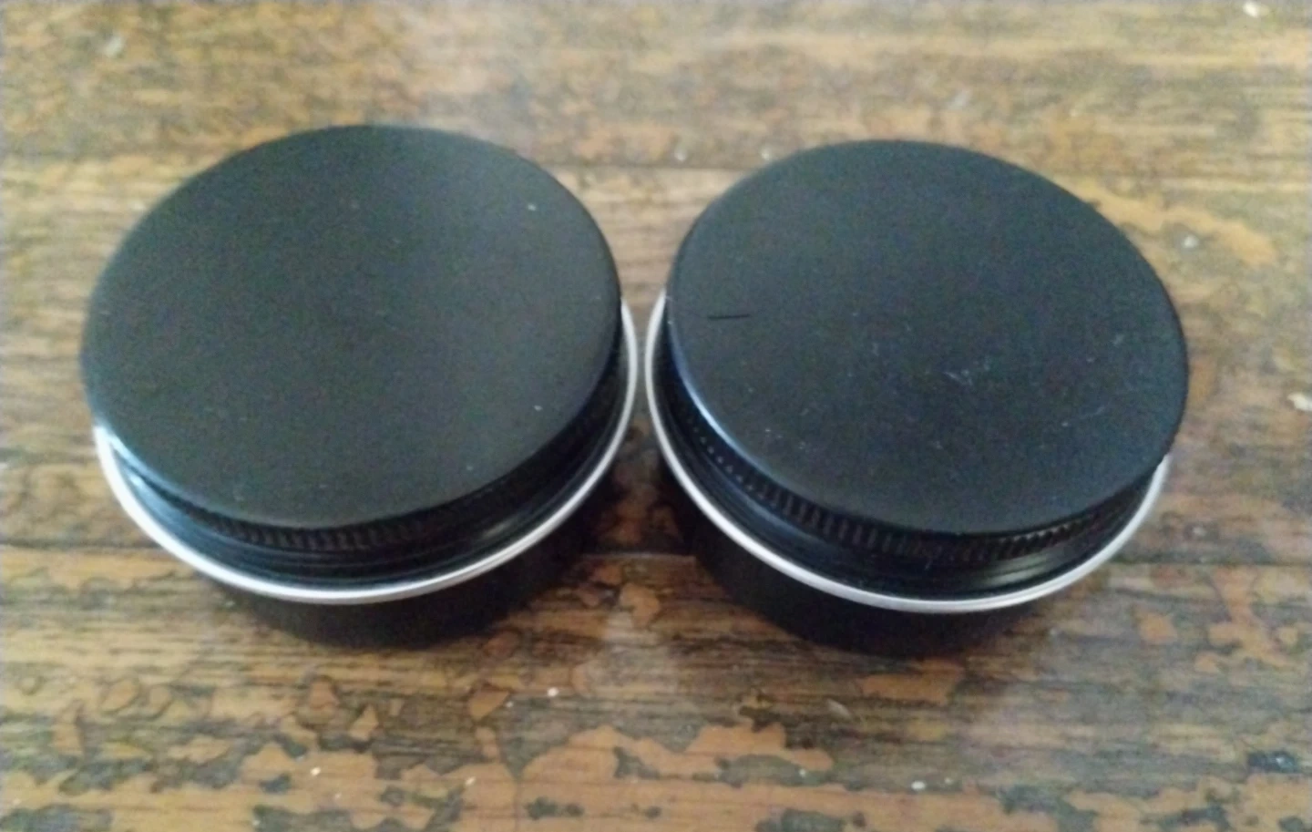 Offering two black screw-top containers. These are simple, reusable storage tins. They're great for small items or travel-sized products.