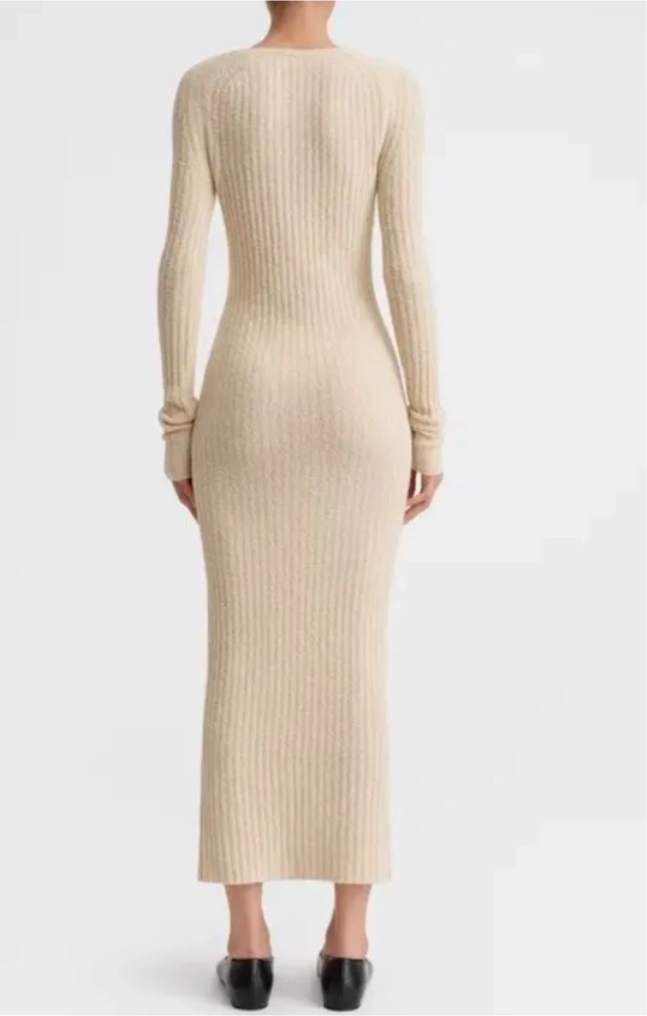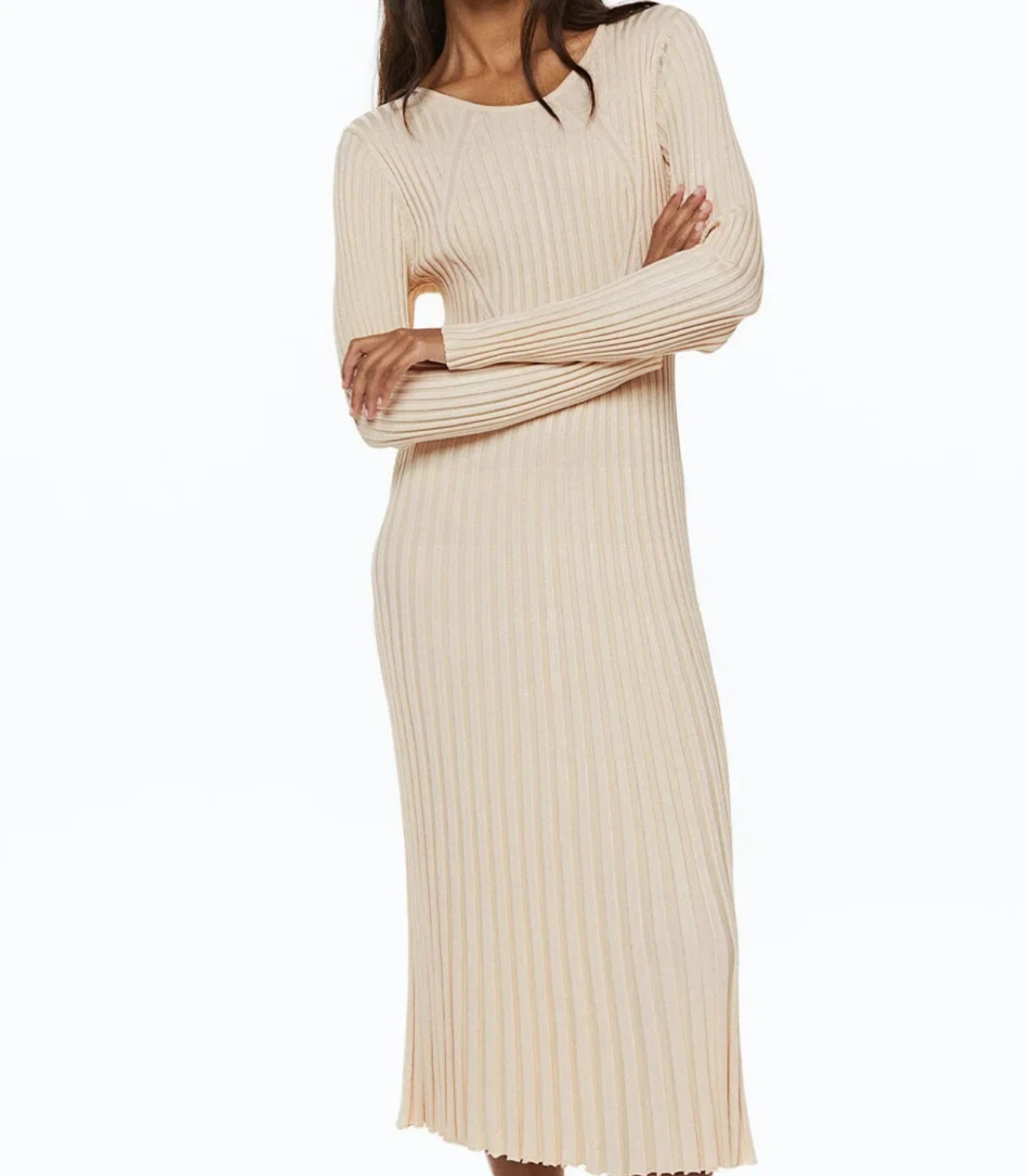 This long-sleeved ribbed knit maxi dress is a versatile addition to any wardrobe. Made from a comfortable knit material. It's perfect for layering or wearing on its own.
