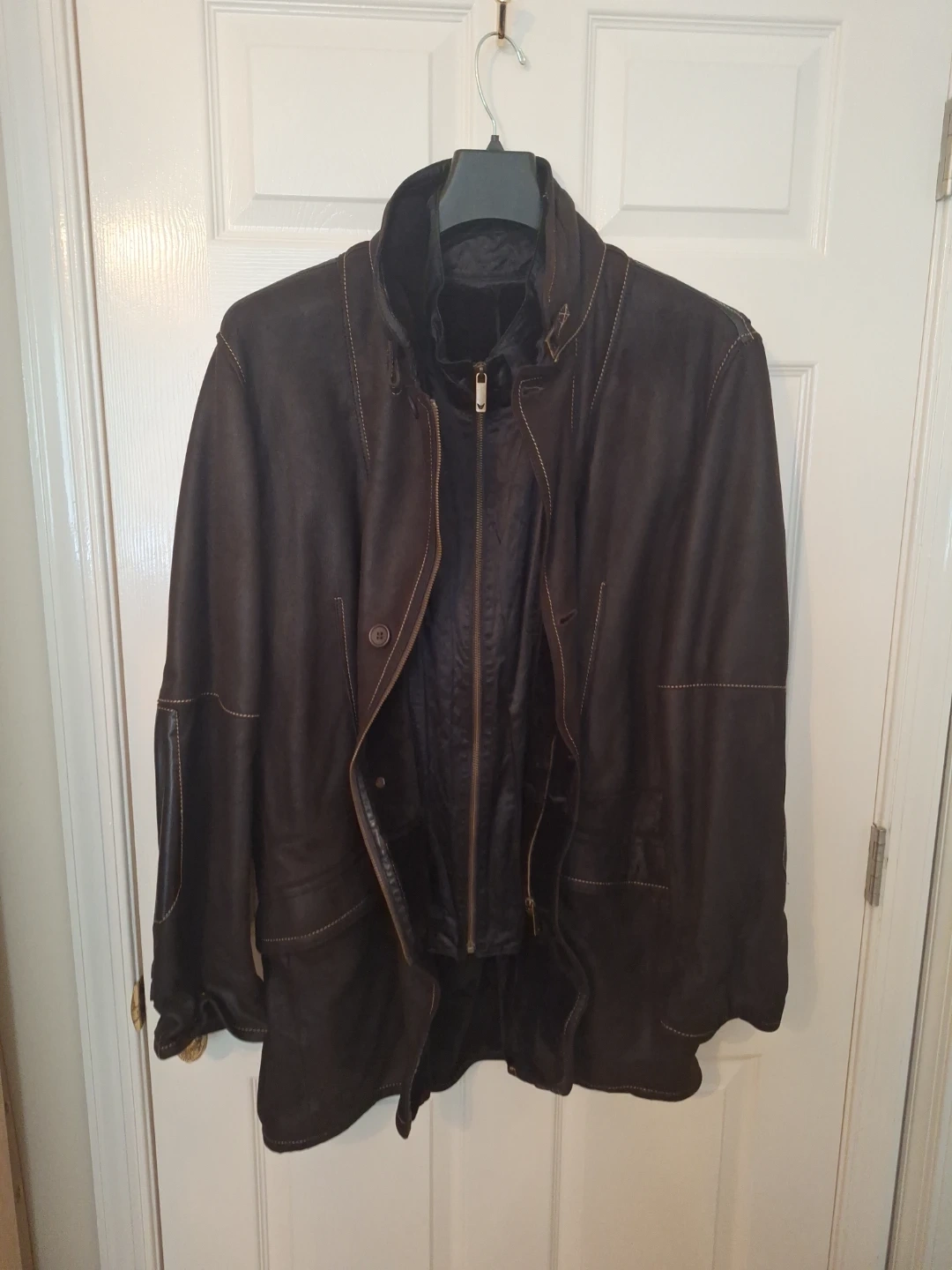 60Here's a stylish brown leather jacket! It's in great condition and ready for a new home. The jacket features a classic design and durable material, perfect for adding a touch of sophistication to any outfit. It's a versatile piece that can be dressed up or down, making it a great addition to your wardrobe inner lining made from lamb skin