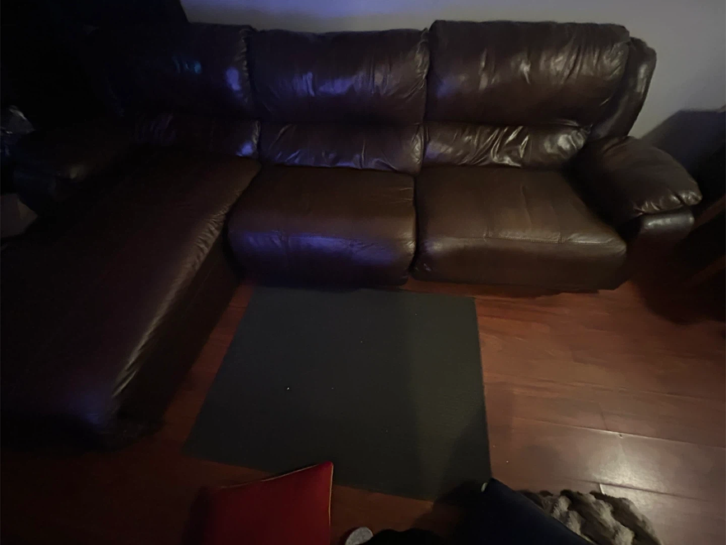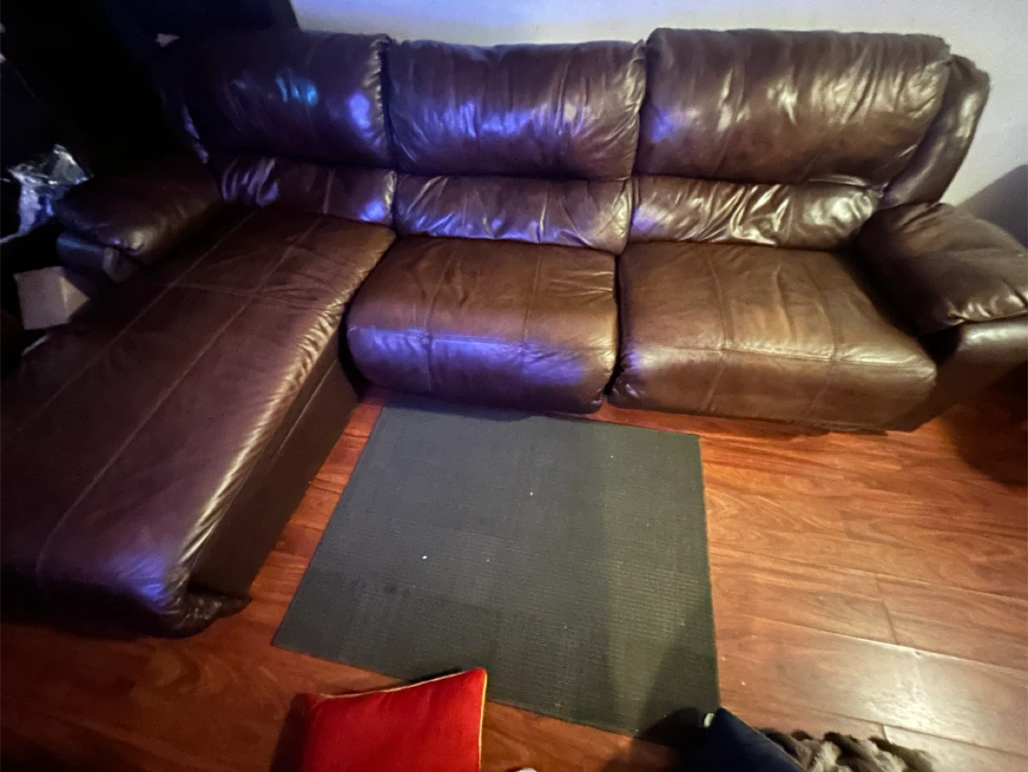 10Selling a comfortable brown leather sectional sofa. It's in good condition and perfect for a living room or entertainment space. The sofa features a chaise lounge on one end for extra relaxation. It has some signs of wear but has plenty of life left!