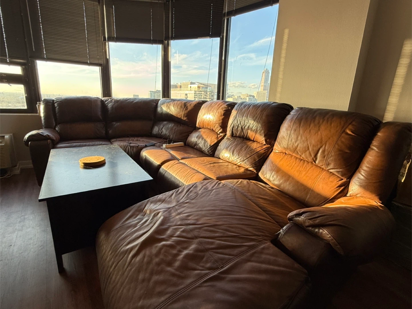 10Selling a comfortable brown leather sectional sofa. It's perfect for a living room or entertainment area. The sofa shows some signs of wear, but it's still in good condition and has plenty of life left.