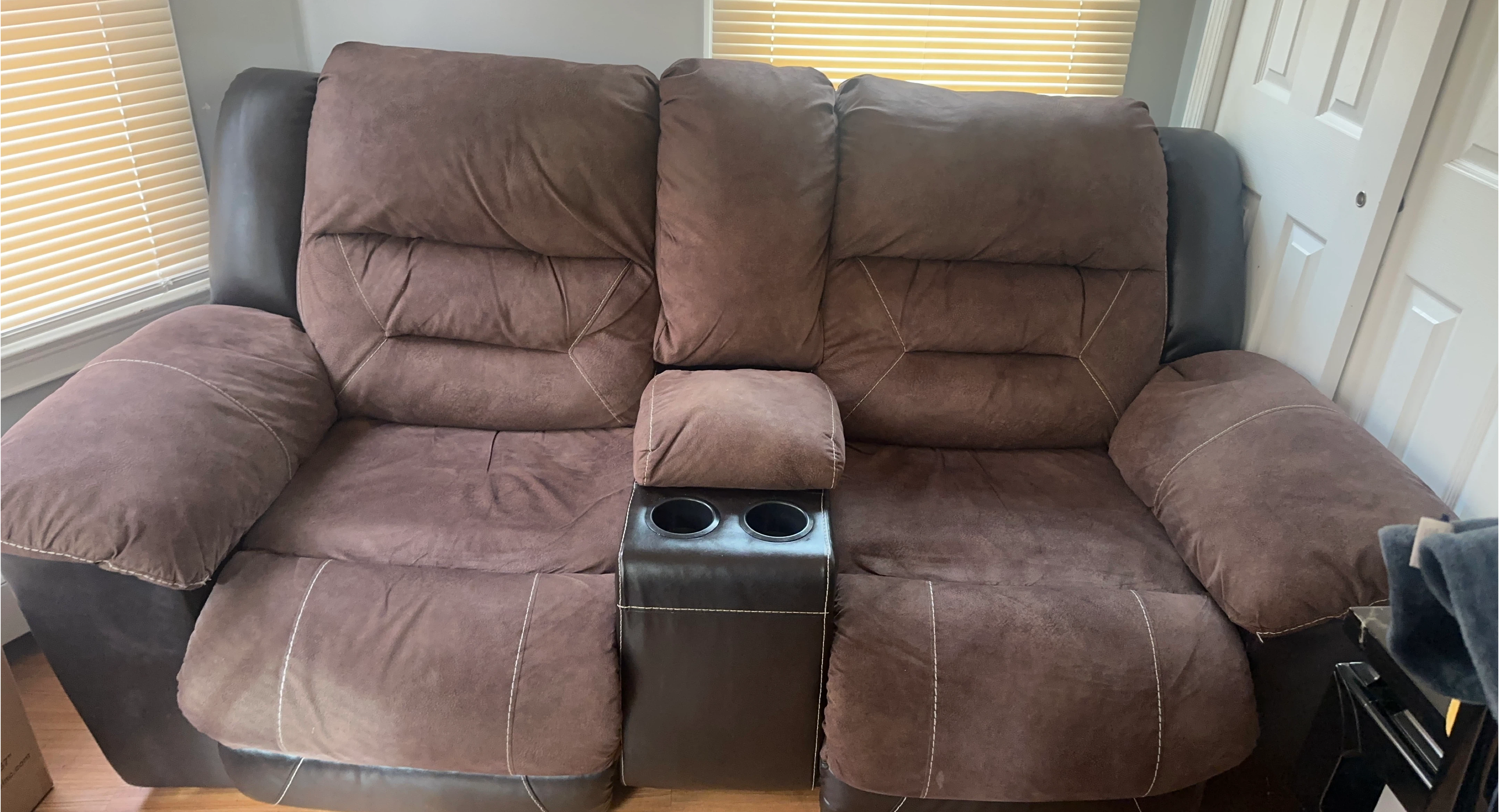 60Selling a comfy brown reclining loveseat! It features a center console with cupholders, perfect for movie nights or just relaxing. The loveseat is in good condition and ready for a new home