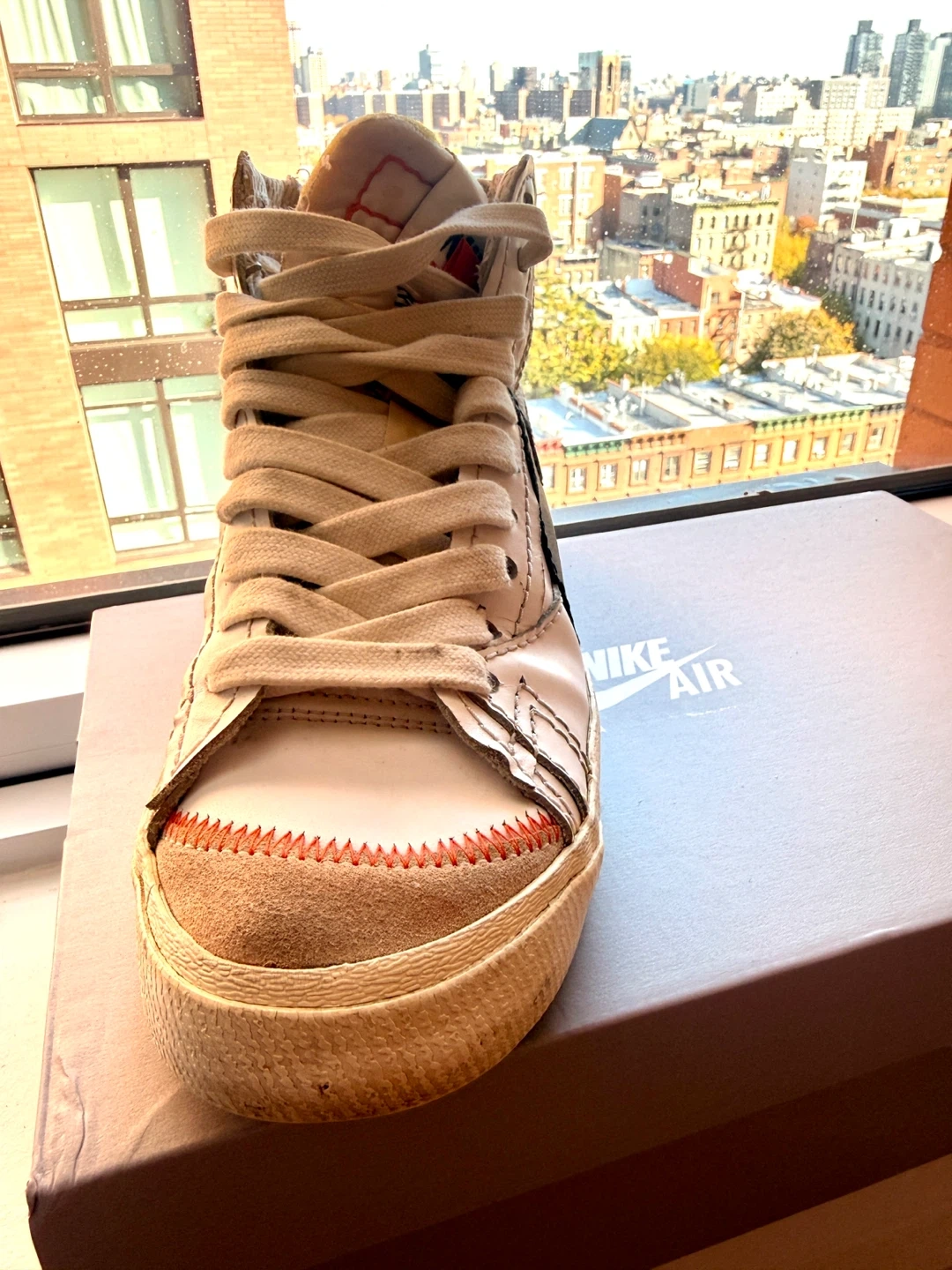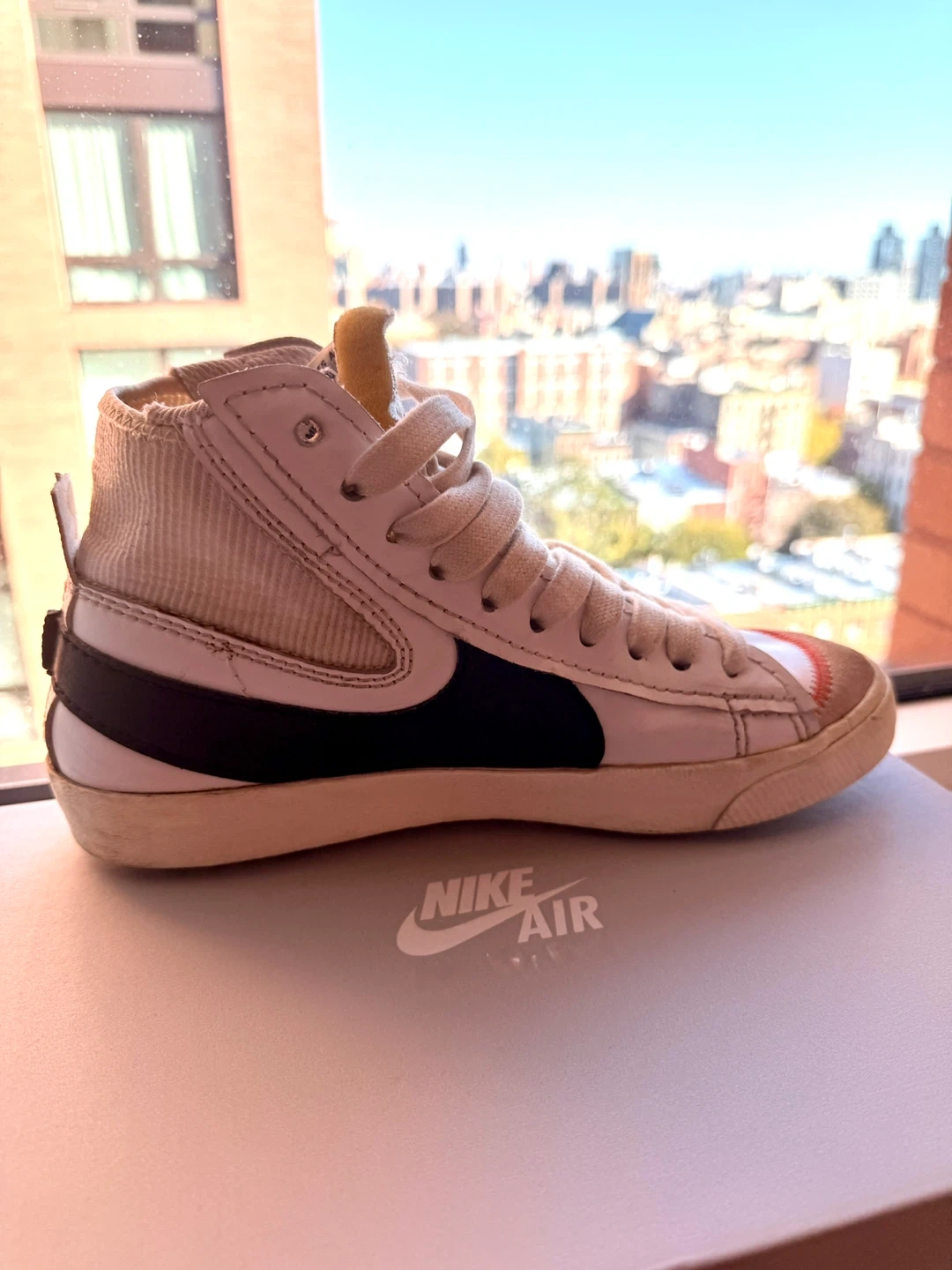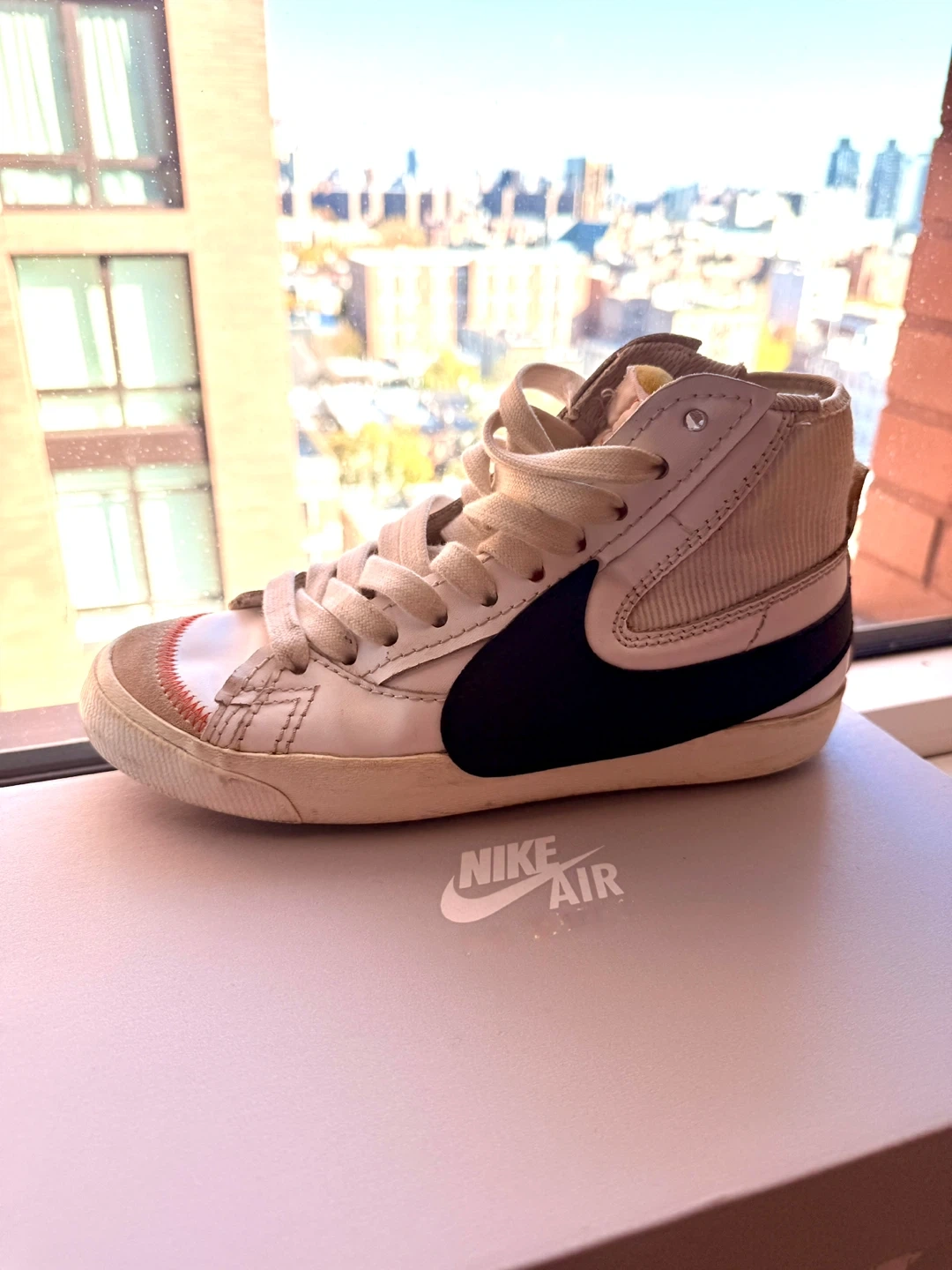 Selling a pair of Nike Blazer Mid '77 Vintage sneakers. They have a classic look with a black swoosh and off-white colorway. These are a stylish and comfortable option for everyday wear. Comes with the original box!
