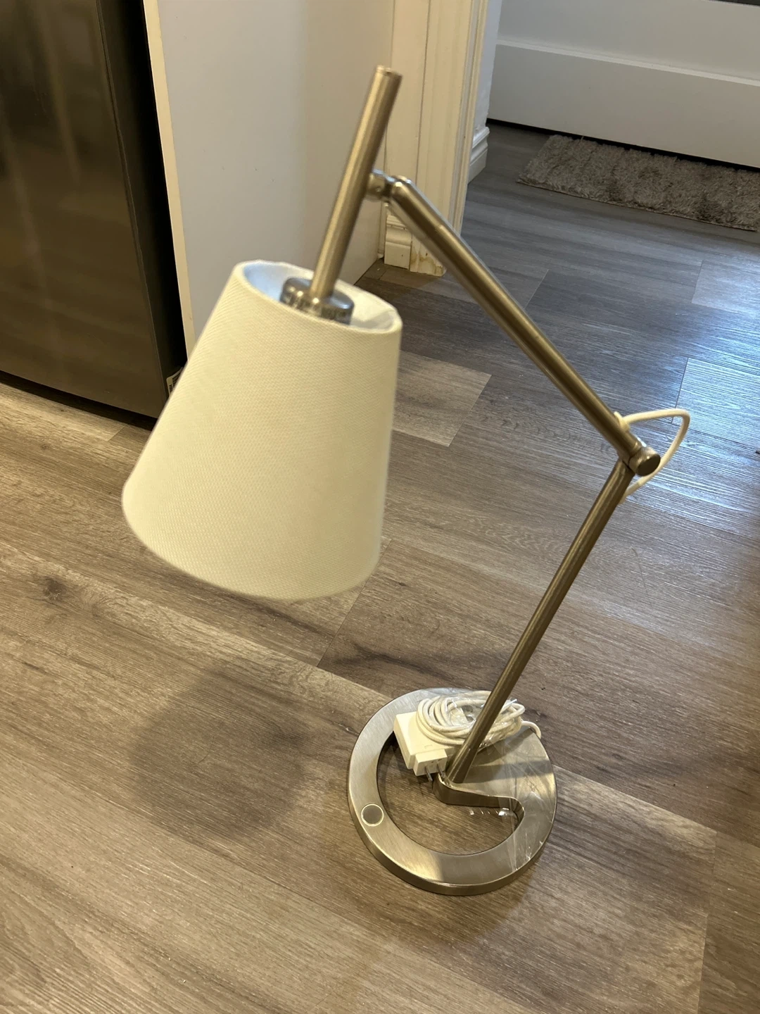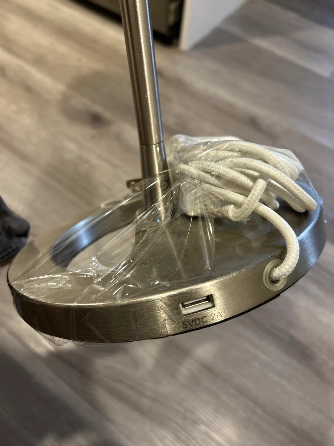 This IKEA Nyfors table lamp features a brushed metal finish and a white fabric shade. It includes a USB port on the base for convenient charging. Perfect for a desk or bedside table!