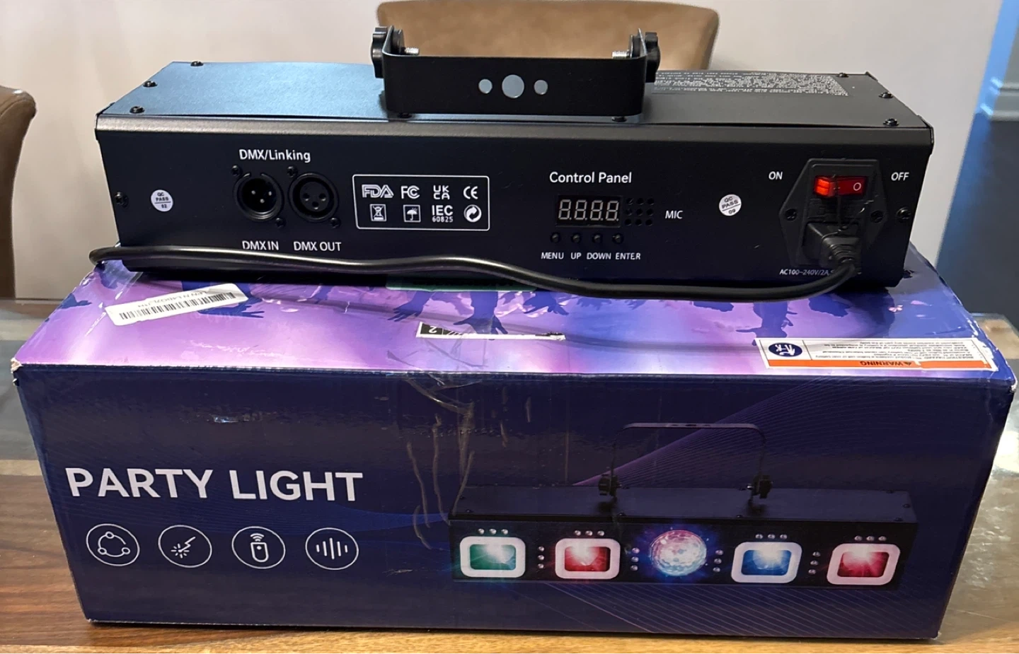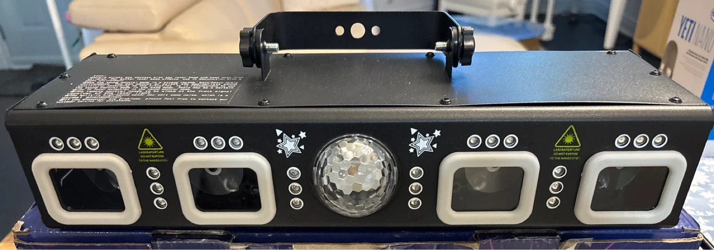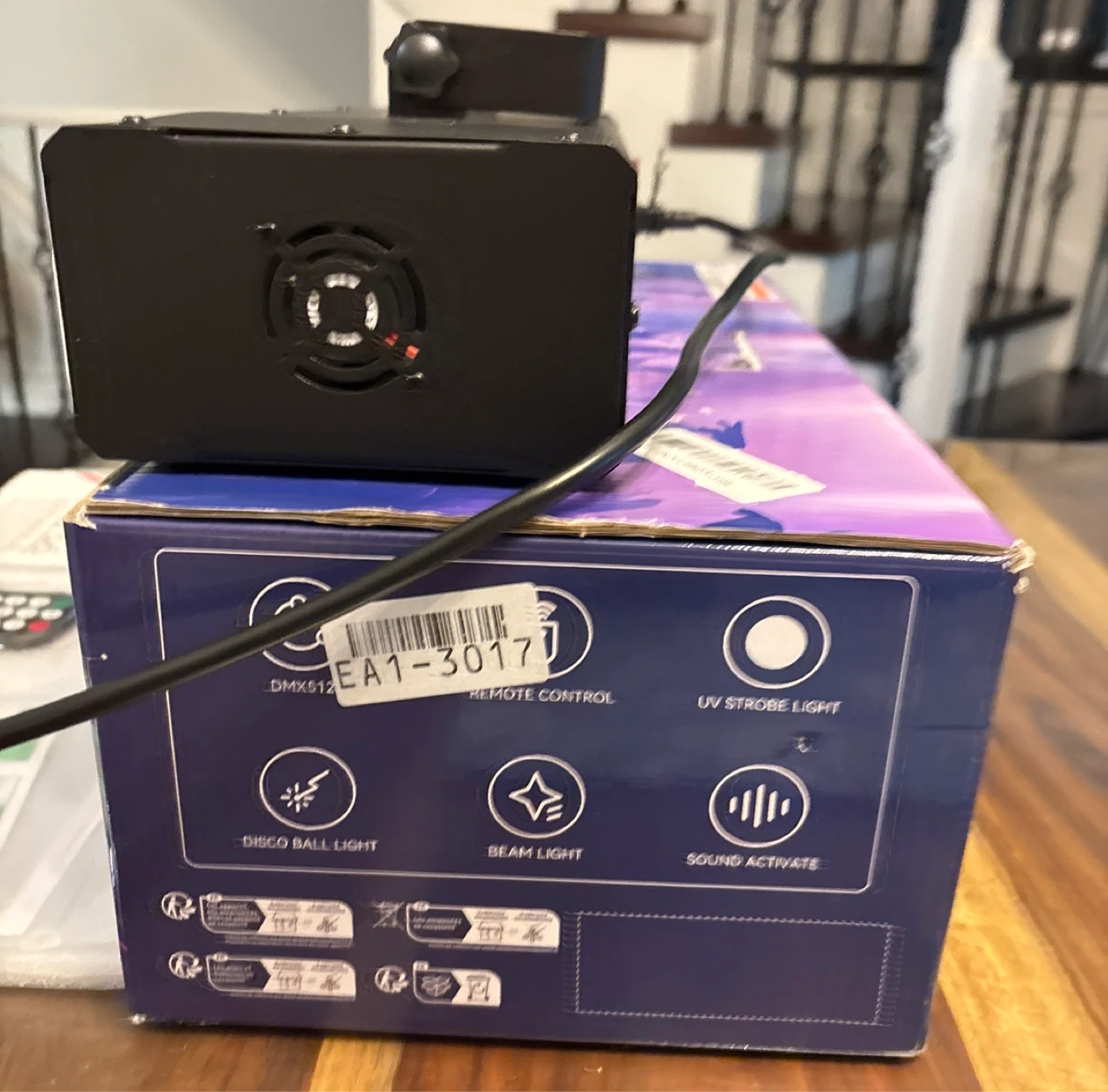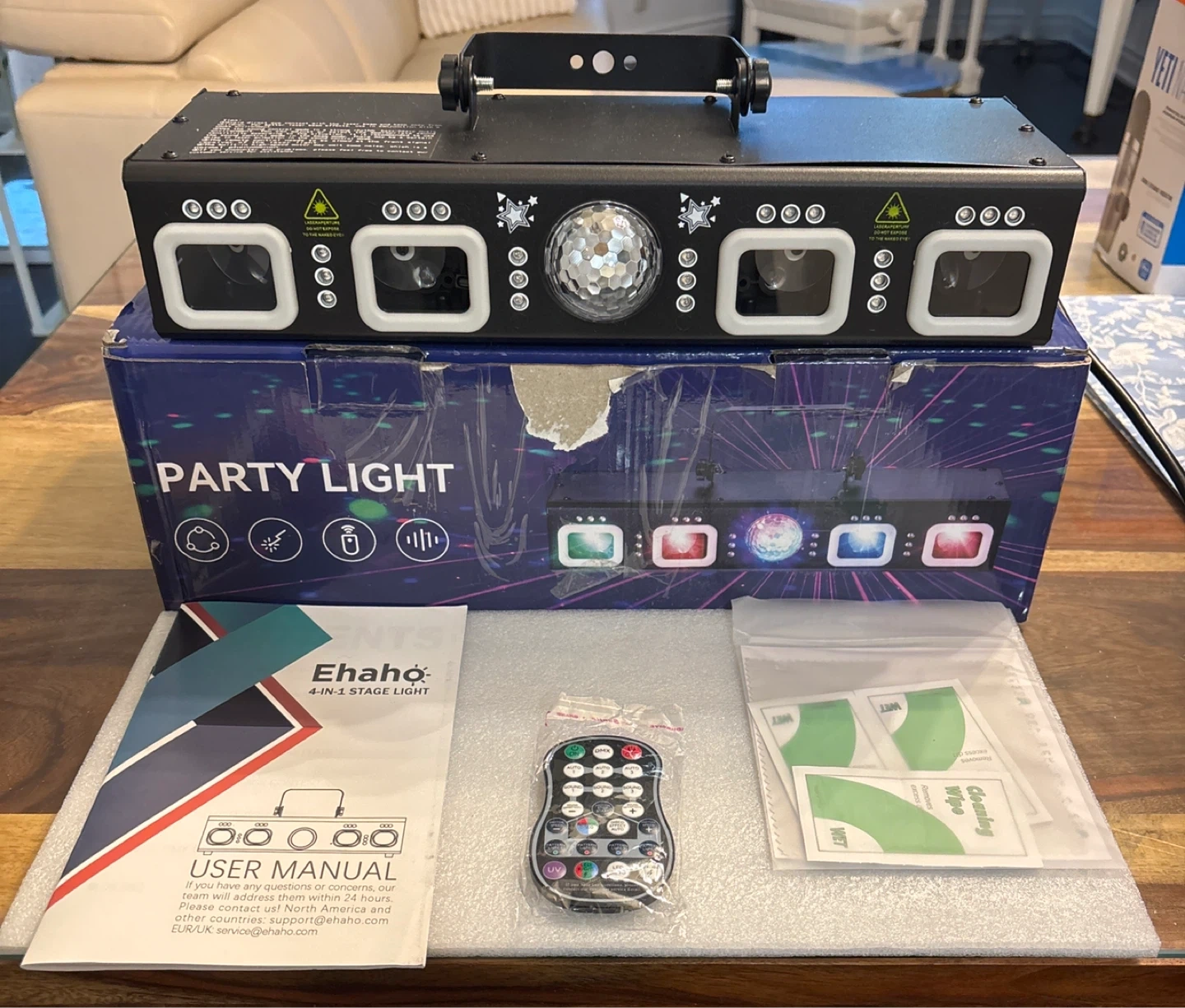 NEW OPEN BOX Get the party started with this Ehaho 4-in-1 stage light! It features a disco ball light, beam light, and UV strobe light, all sound-activated for maximum fun. It's in perfect condition and ready to light up any room!