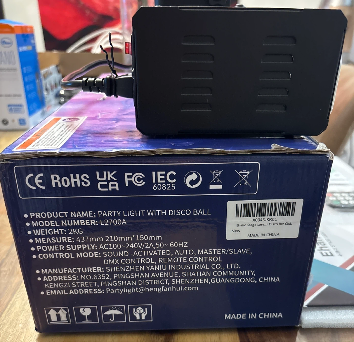 Selling a brand new Ehaho Party Light with Disco Ball, model L2700A! It's still in its original box and includes the user manual and remote control.