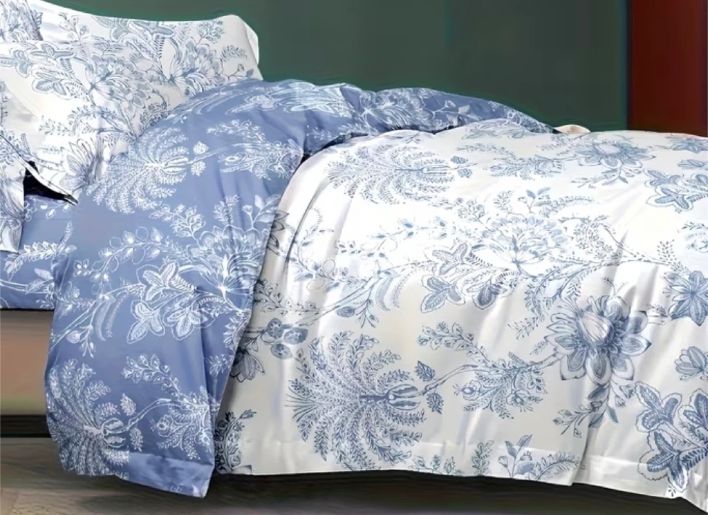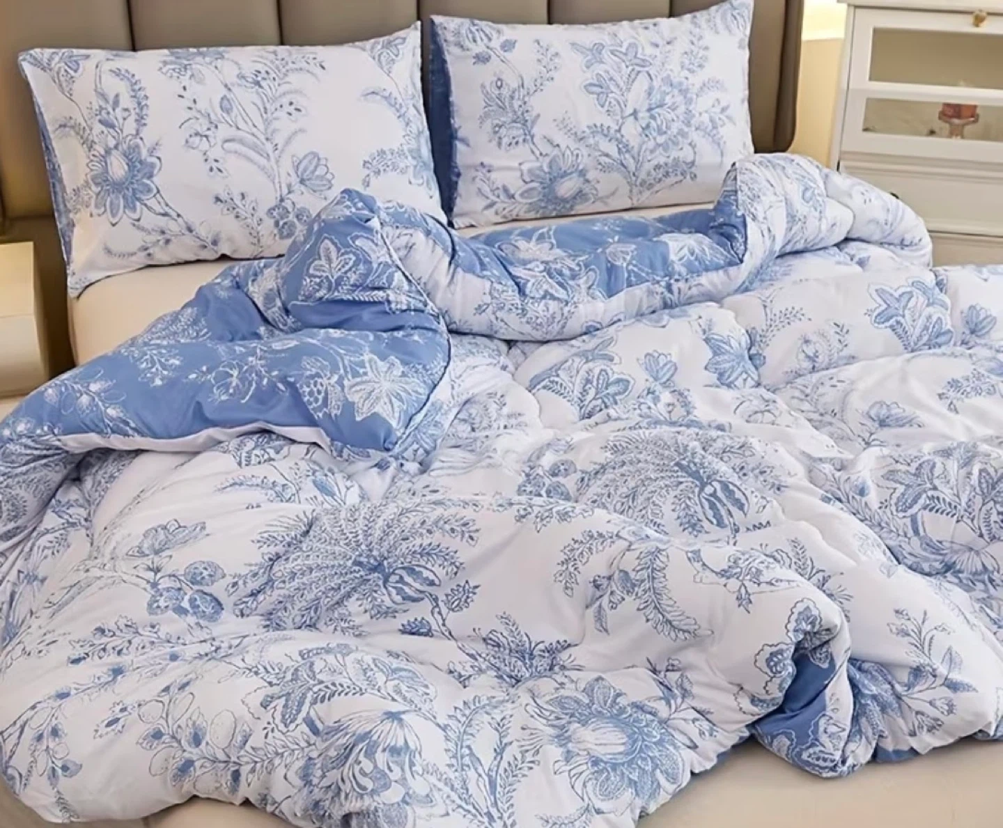 Queen setThis bedding set features a classic blue and white floral toile pattern.