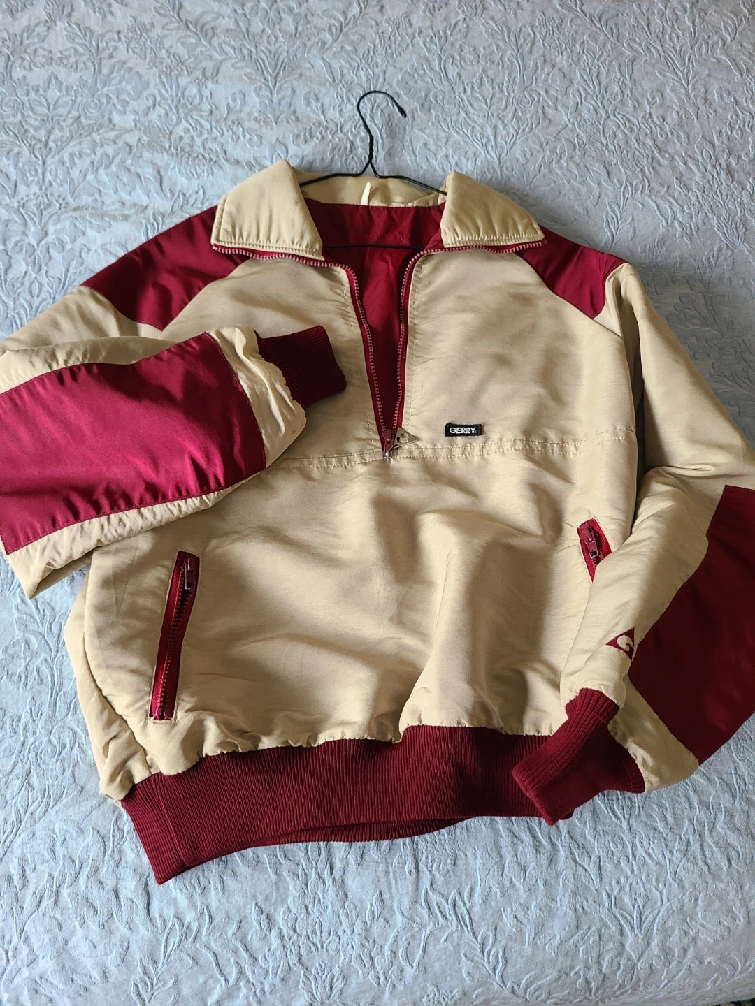 Cozy Gerry pullover jacket in beige and burgundy! This jacket is perfect for layering during those chilly days. It features a quarter-zip closure and convenient zip pockets on the sleeves. The ribbed cuffs and hem add a snug fit to keep you warm and comfortable Water proof