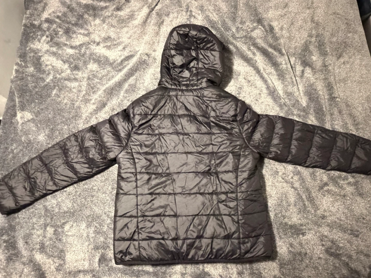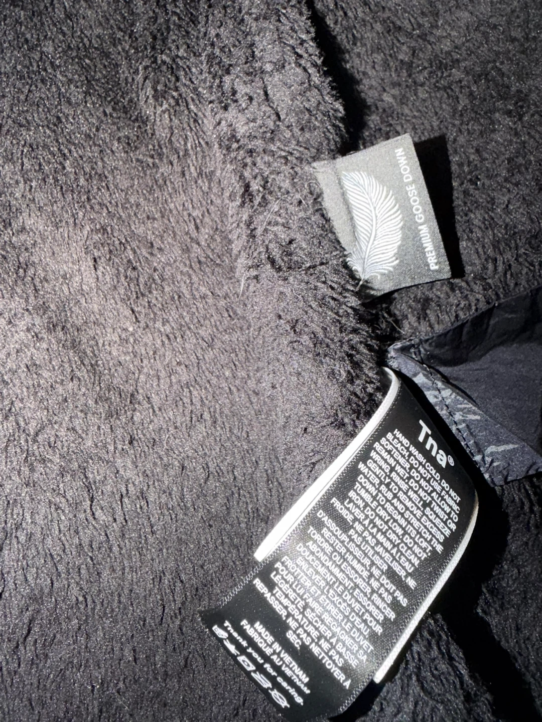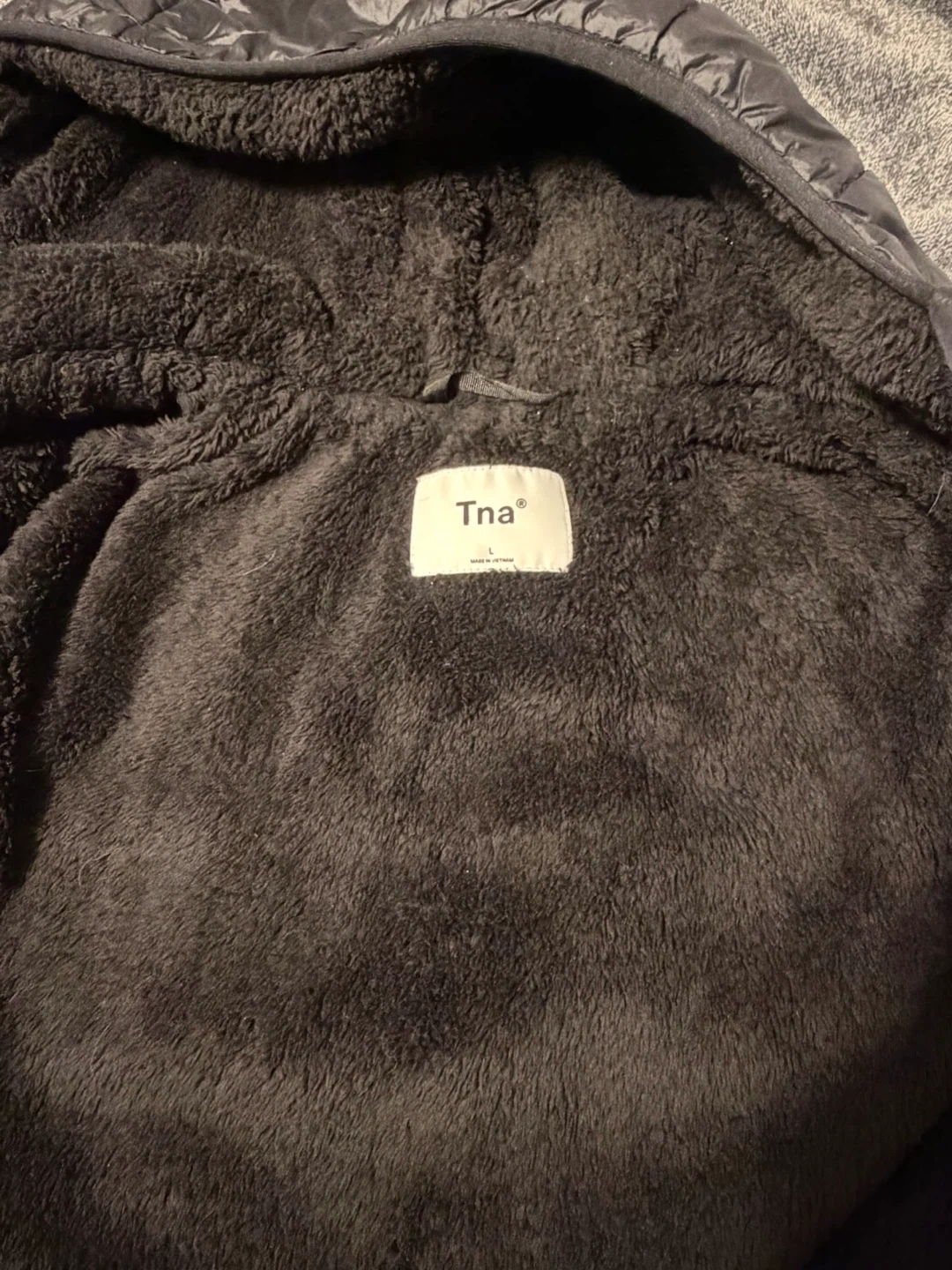 This Tna puffer jacket is black with a cozy fleece lining and a hood. It's made with premium goose down for warmth. Size is large and it's made in Vietnam. Great for colder weather!