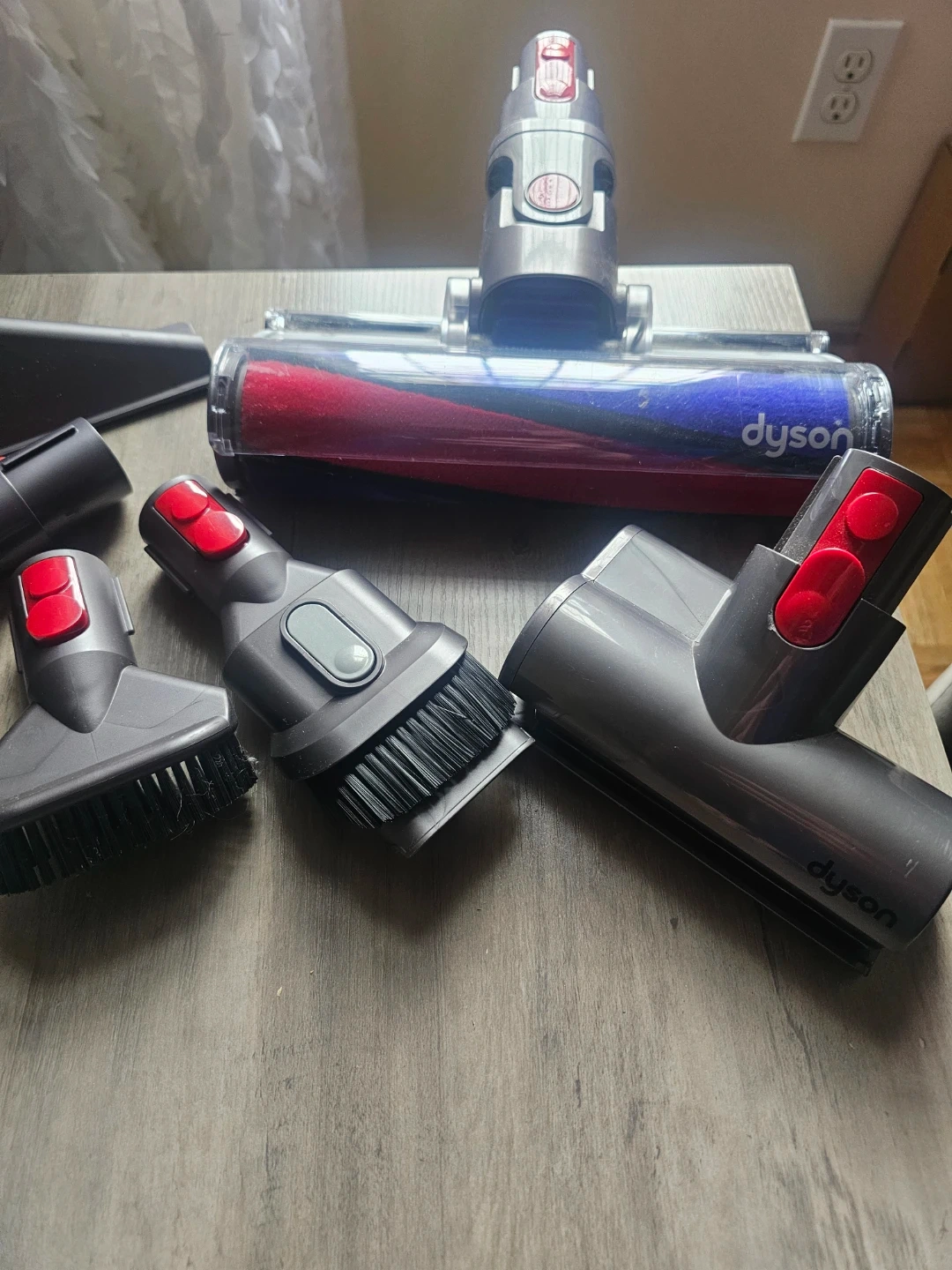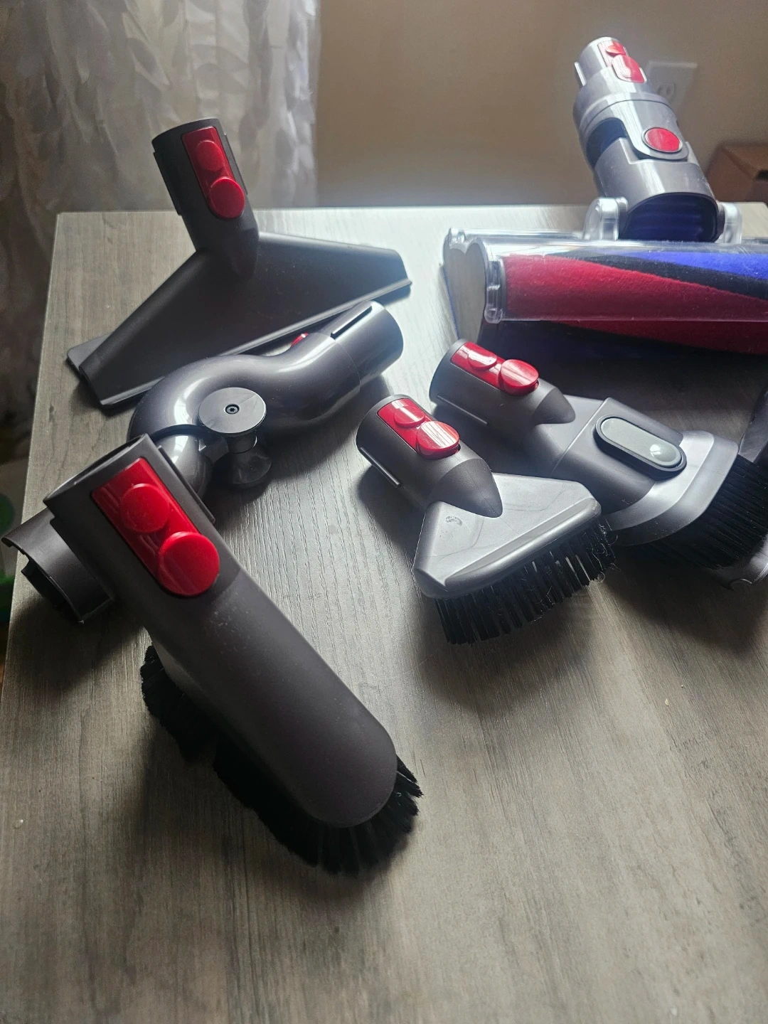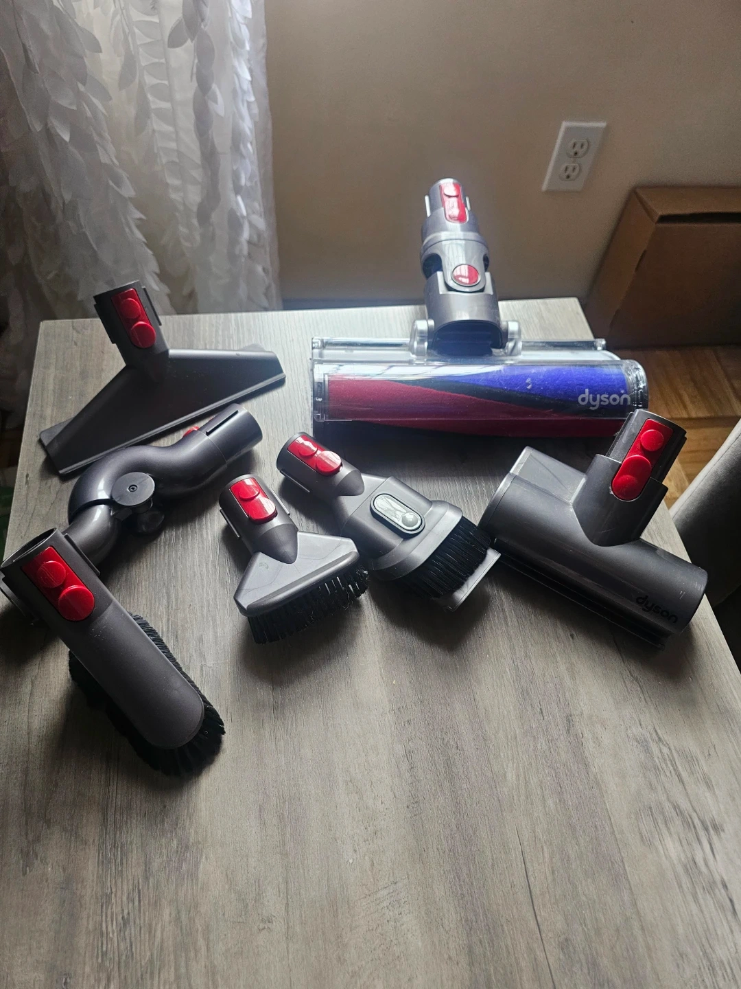 Set of Dyson vacuum cleaner attachments. Includes a main brush head with roller, crevice tool, brush tool, and other specialized nozzles. These are designed to help with various cleaning tasks around the house.