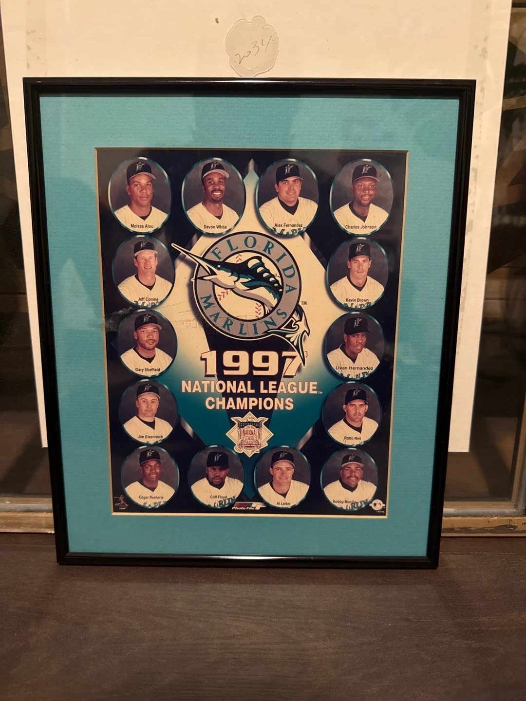 This framed photo celebrates the Florida Marlins' 1997 National League Championship. It features the team logo and portraits of key players. A great piece for any baseball fan! Lots of sun exposure on this one so the color is a bit off.