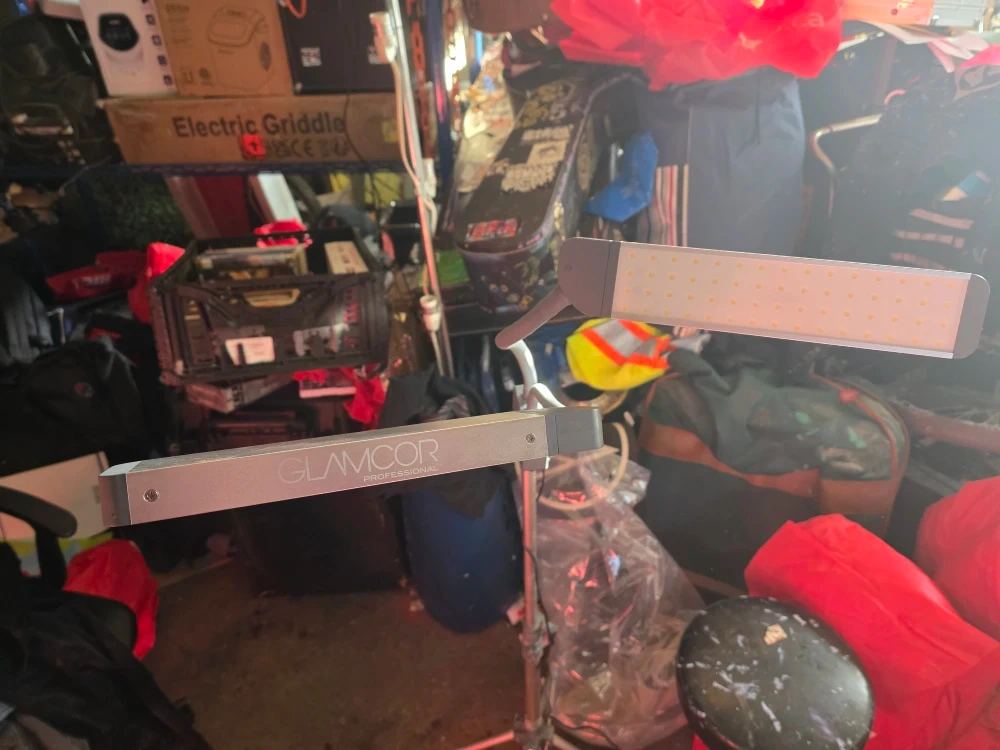 This is a Glamcor Professional LED light. It's a portable lighting solution. It has adjustable brightness and a flexible neck.