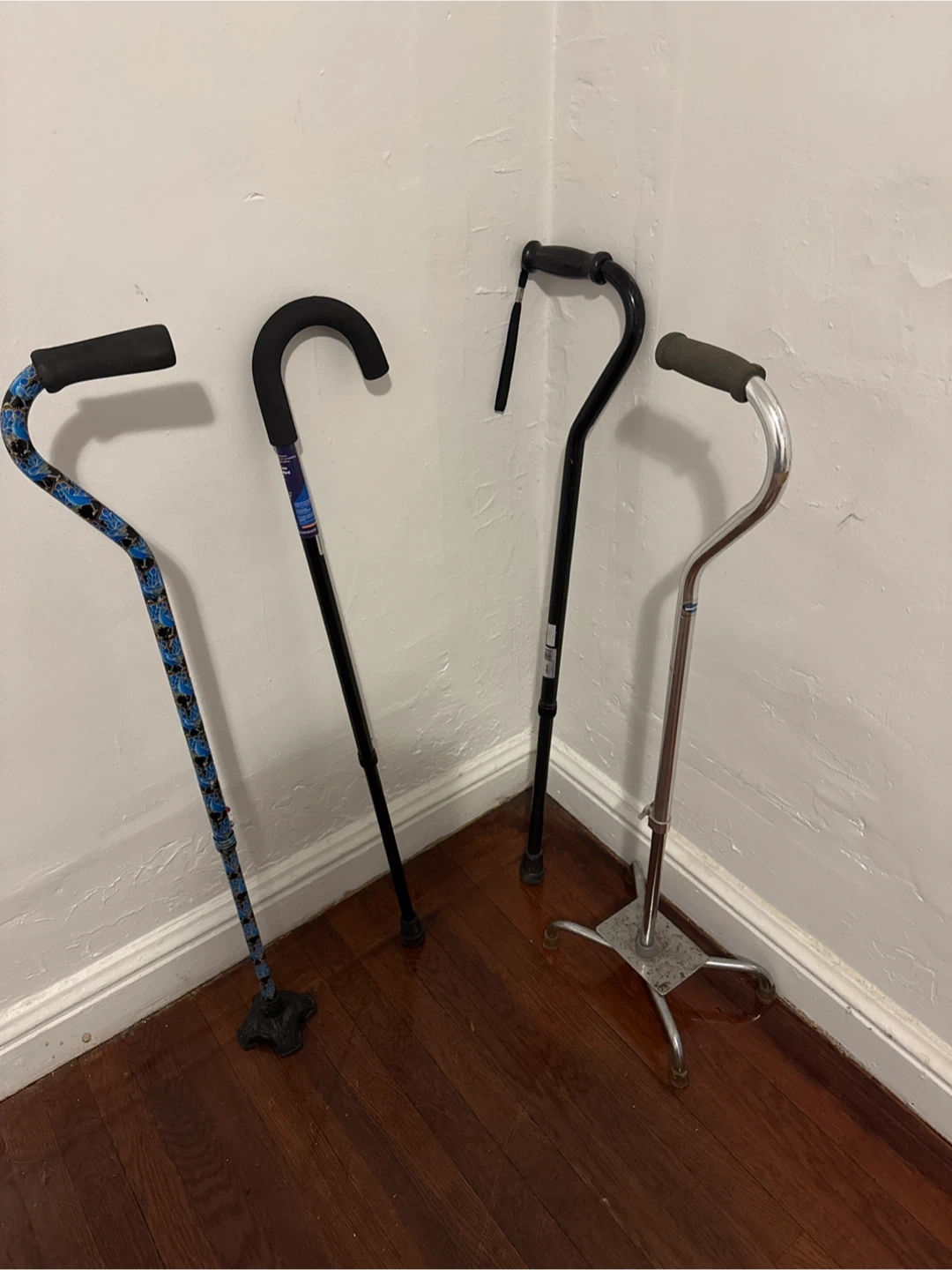 This is a set of four walking canes. It includes two black canes with ergonomic handles, one blue patterned cane with a quad base, and one silver cane with a quad base. PICK UP ASAP - ADDRESS 239 E 242nd IN THE BRONX.