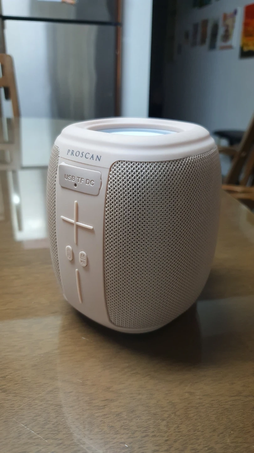 Proscan portable speaker with USB and TF card inputs. It's a light pink colour. This speaker connects wirelessly for music playback.