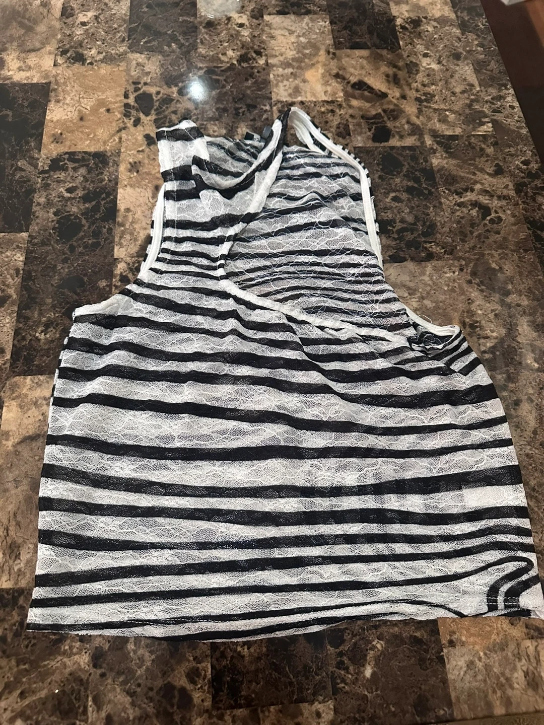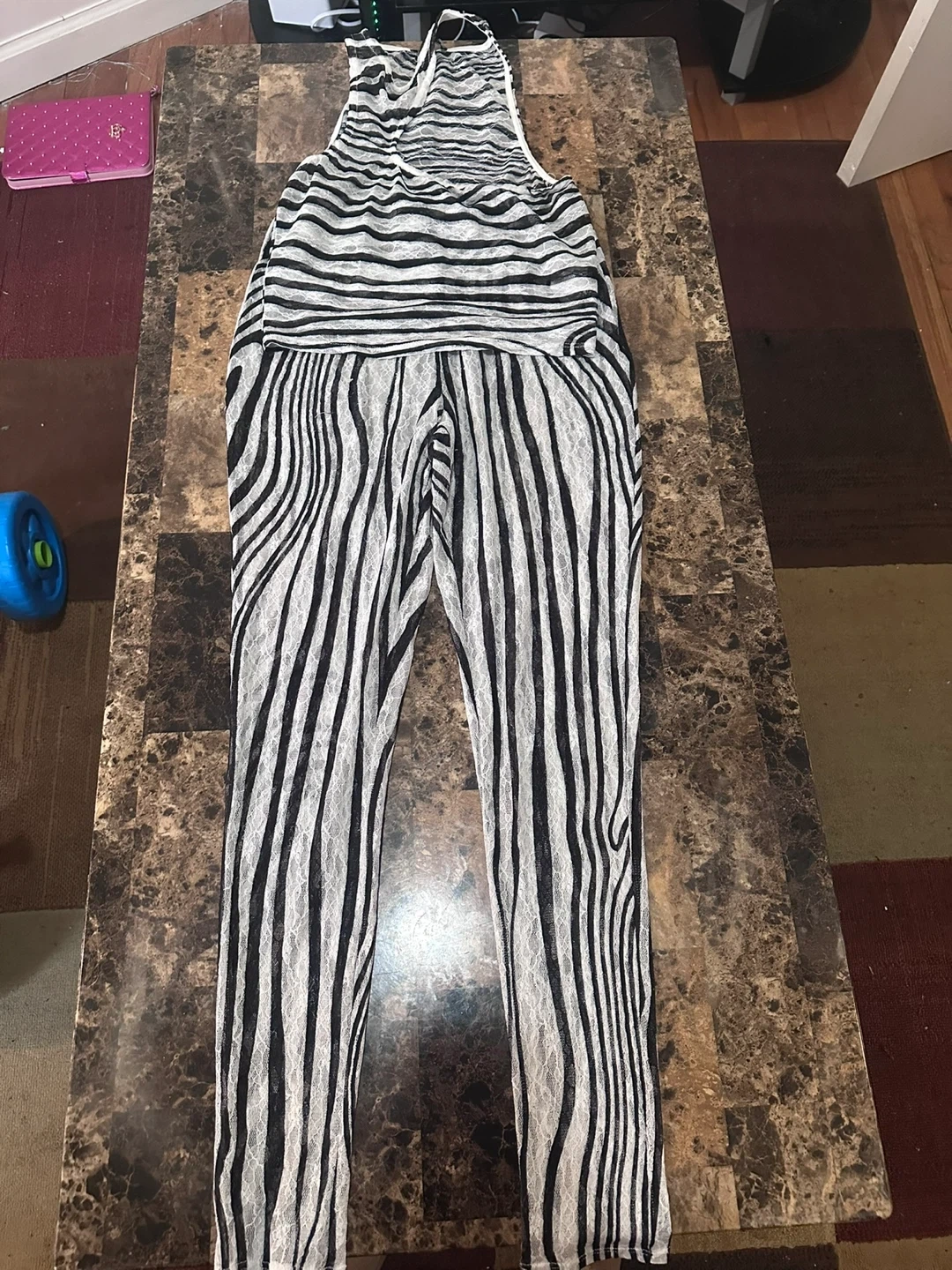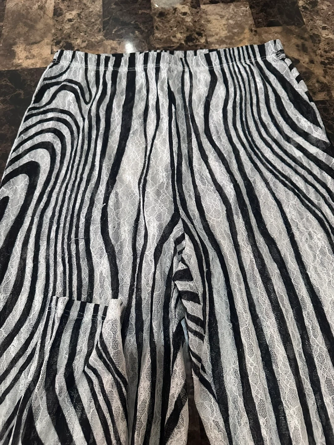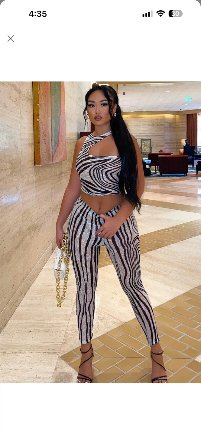 This is a sheer two-piece set with a bold zebra print. It includes a sleeveless halter-style top and matching fitted pants. The fabric appears to be a lightweight, see-through material.