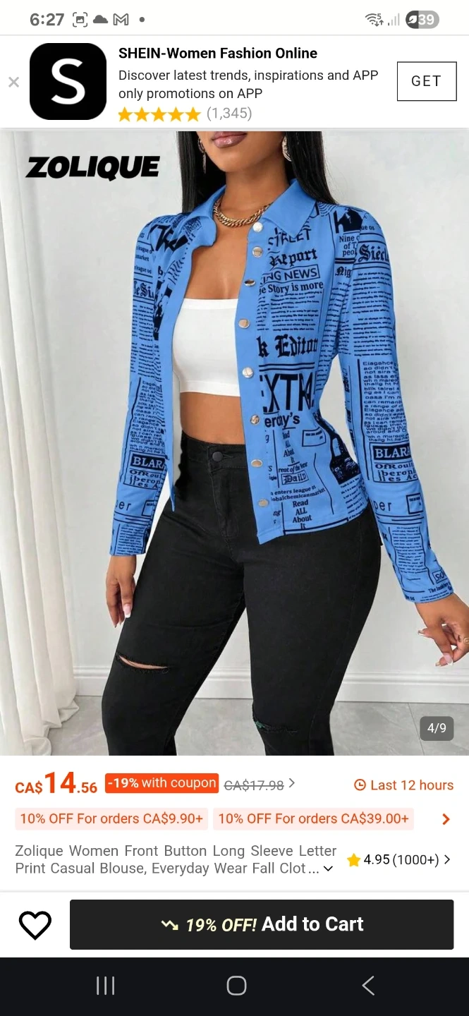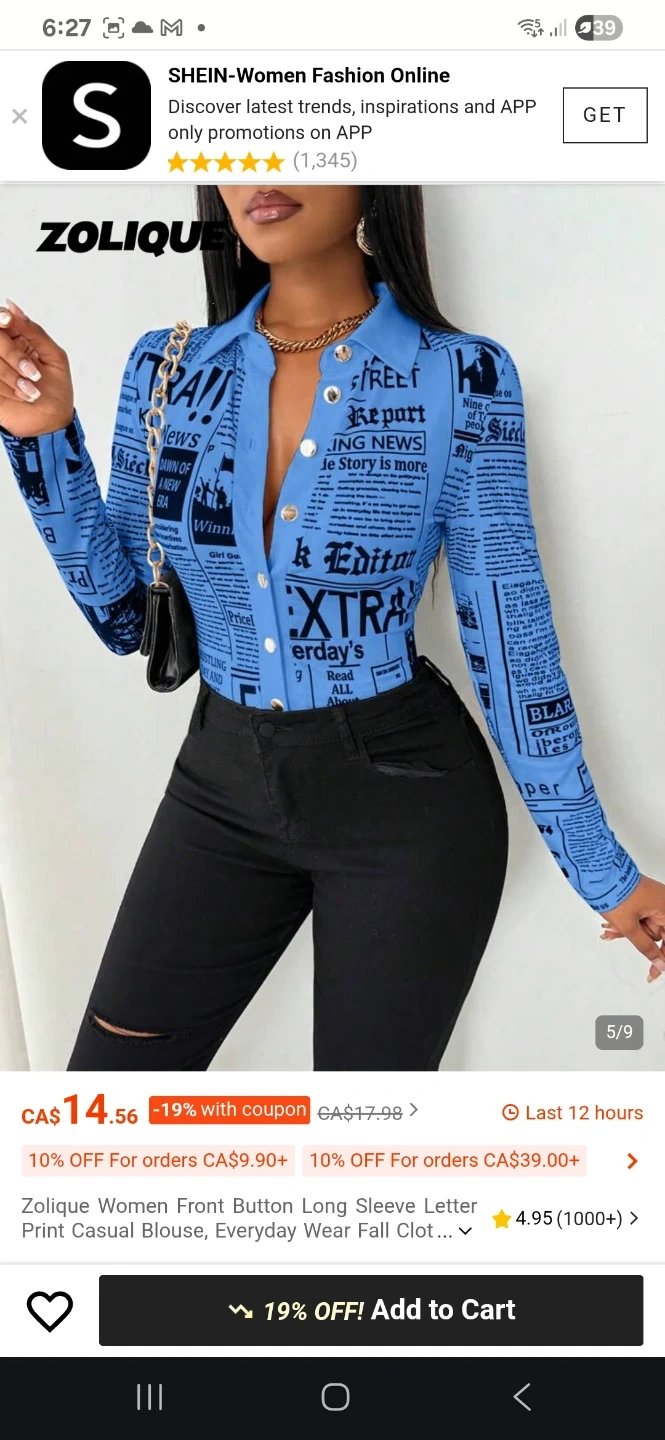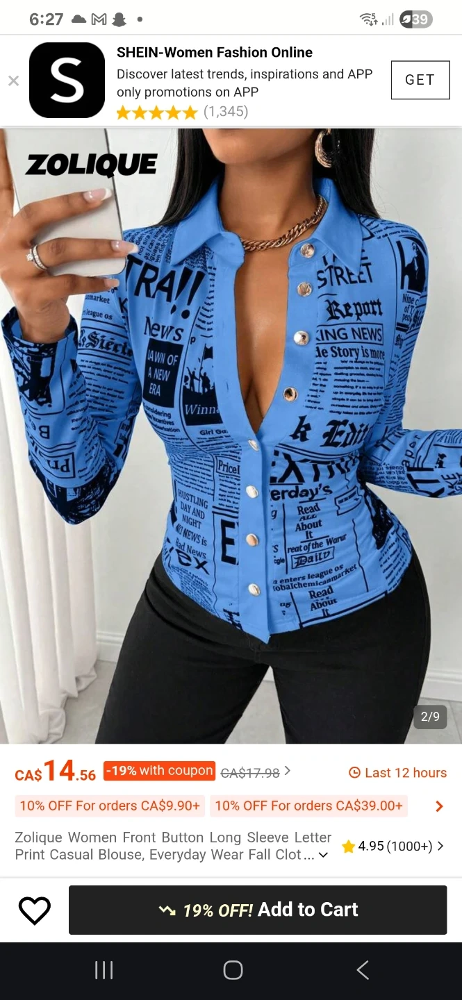 This Zolique blouse features a blue base with a black newspaper print and gold-toned buttons. It's a long-sleeved, collared shirt with a front button closure. This shirt is great for adding a unique statement piece to your wardrobe.