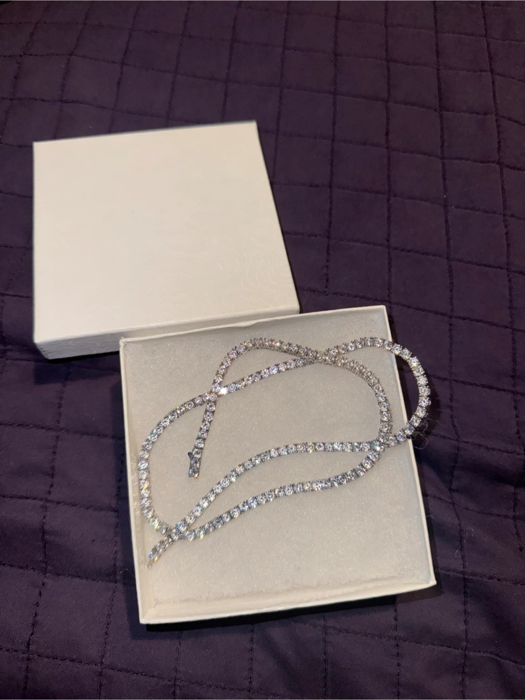 This tennis necklace is adorned with many clear, sparkling stones. It comes in a white gift box. It's ready to add some shine to any outfit!