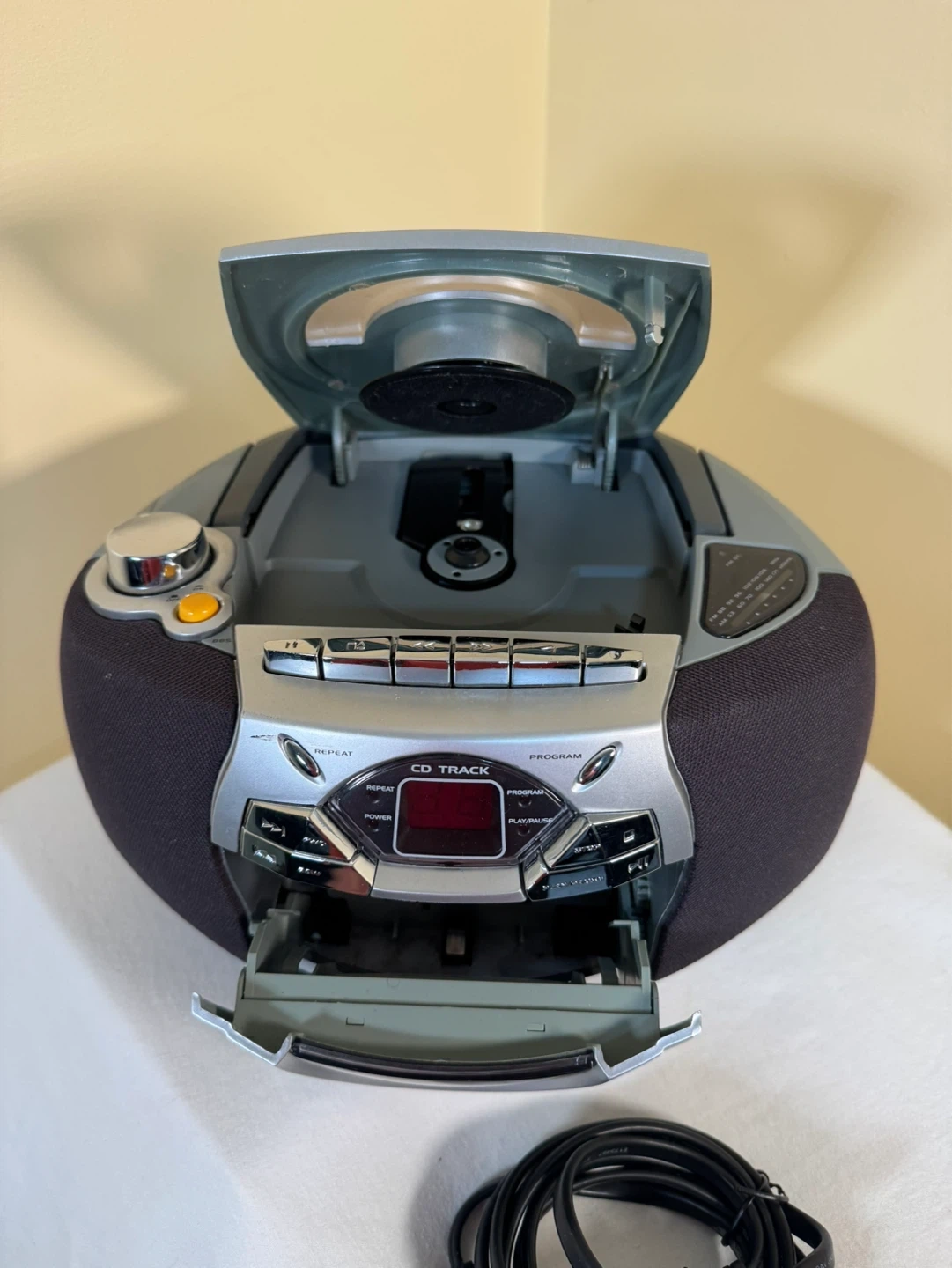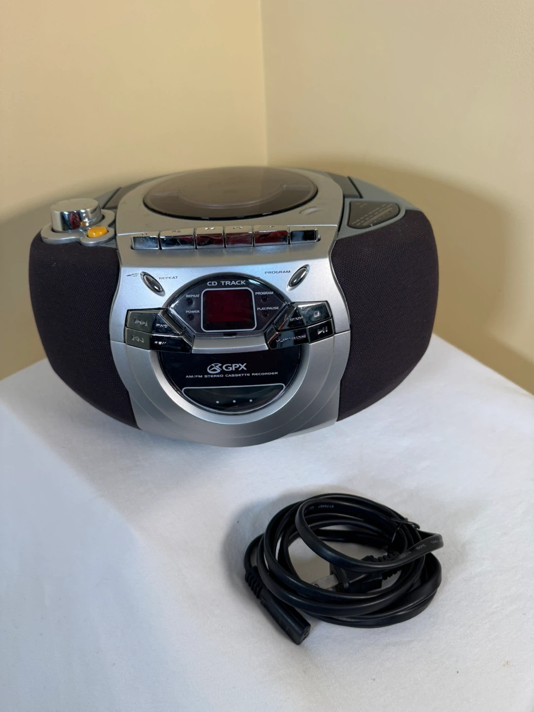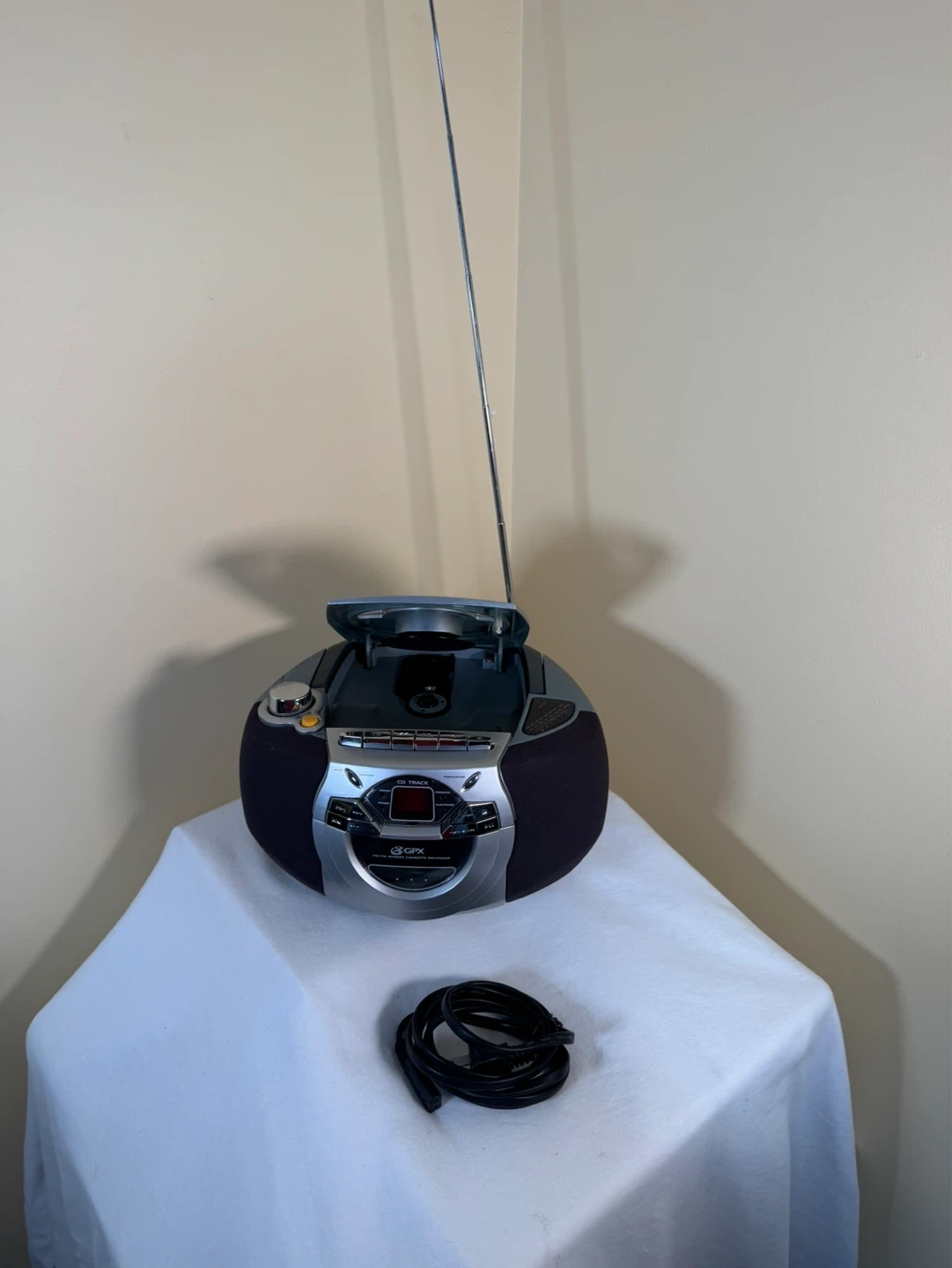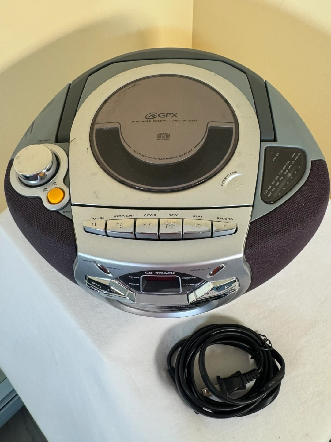 This GPX portable boombox plays CDs and records from the radio to cassette. It has an AM/FM stereo tuner and a portable compact disc player. Includes power cord.