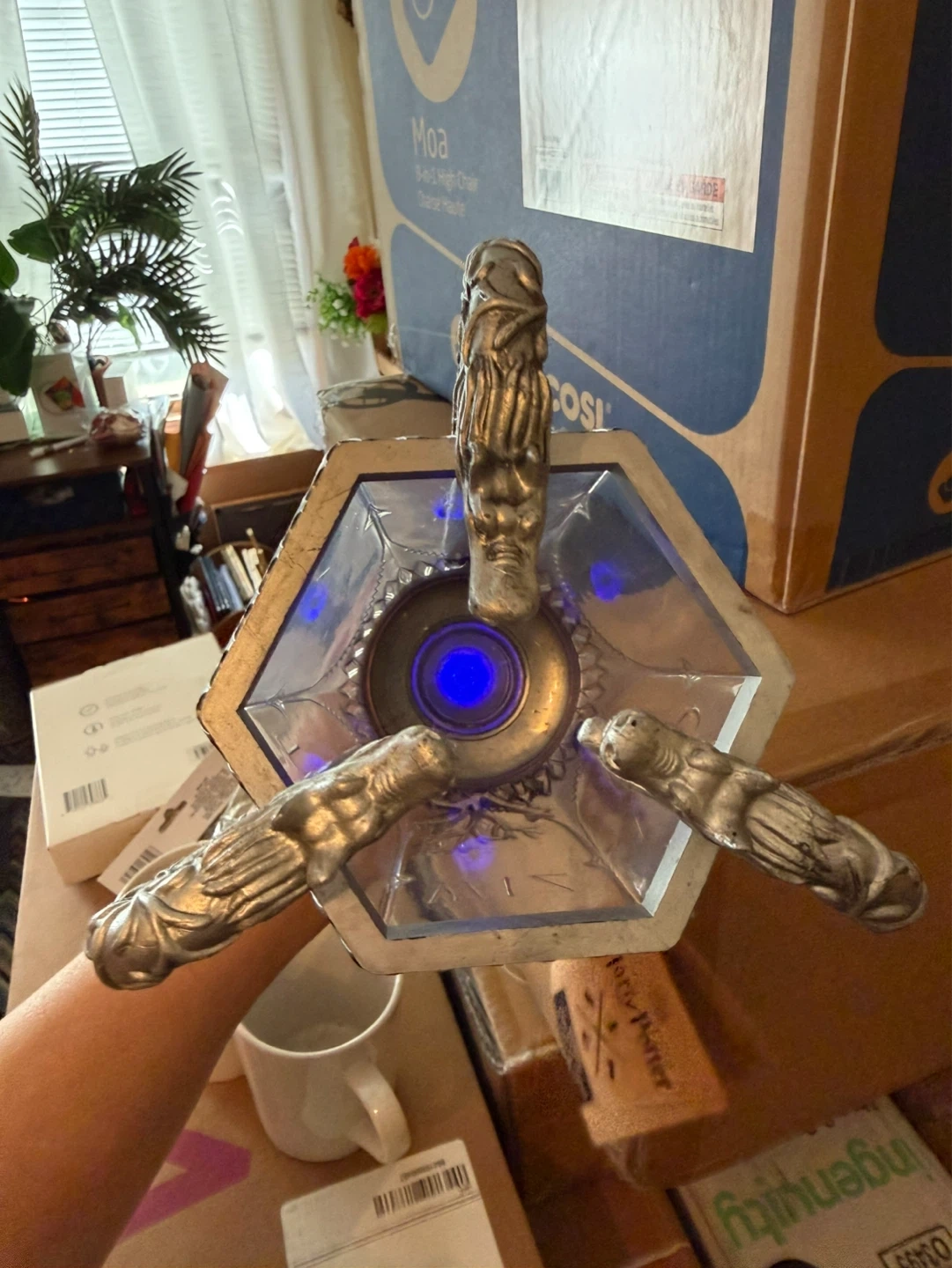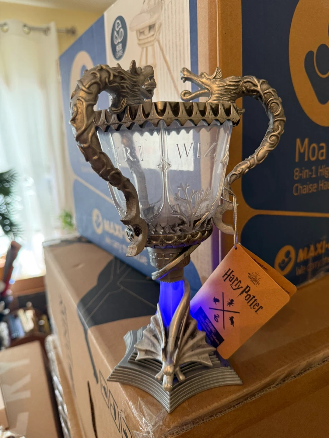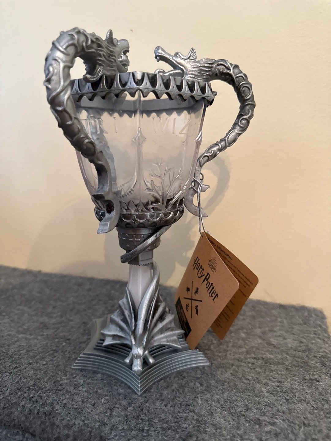 This plastic replica of the Triwizard Cup from Harry Potter lights up with a blue glow! It's designed with dragon handles and intricate detailing. Perfect for any Harry Potter fan's collection.