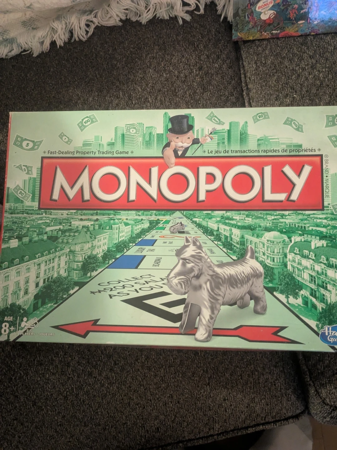 It's the classic Monopoly board game. This version is recommended for ages 8 and up, and supports 2-6 players. Play time is sure to be a blast!