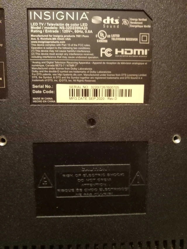 I'm selling a used Insignia 32" LED TV, model NS-32D220NA20. It has been well-maintained and is in good working condition. This TV offers a crisp, clear picture and is perfect for a bedroom, kitchen, or any smaller space. Key features: Screen Size: 32 inches Display Technology: LED. If the ad is up, it's still available!