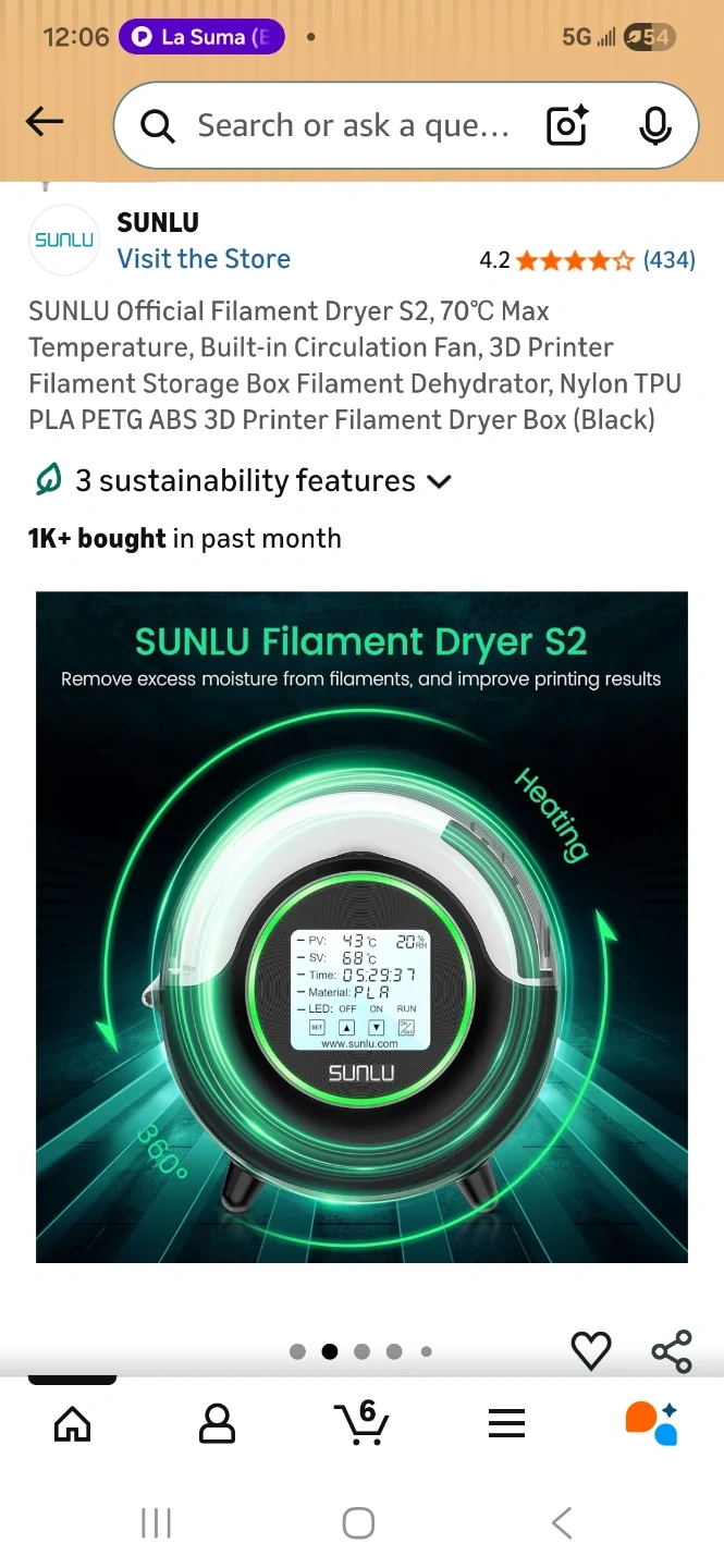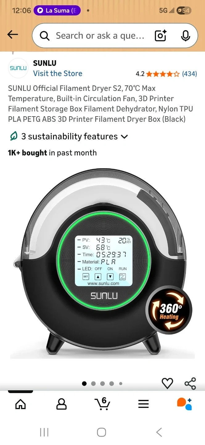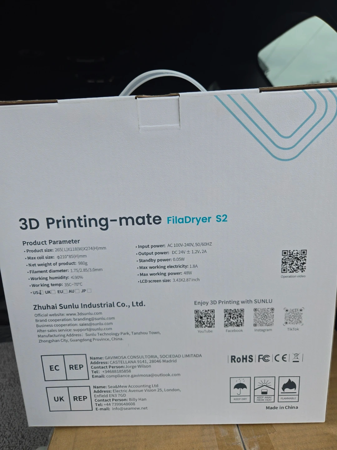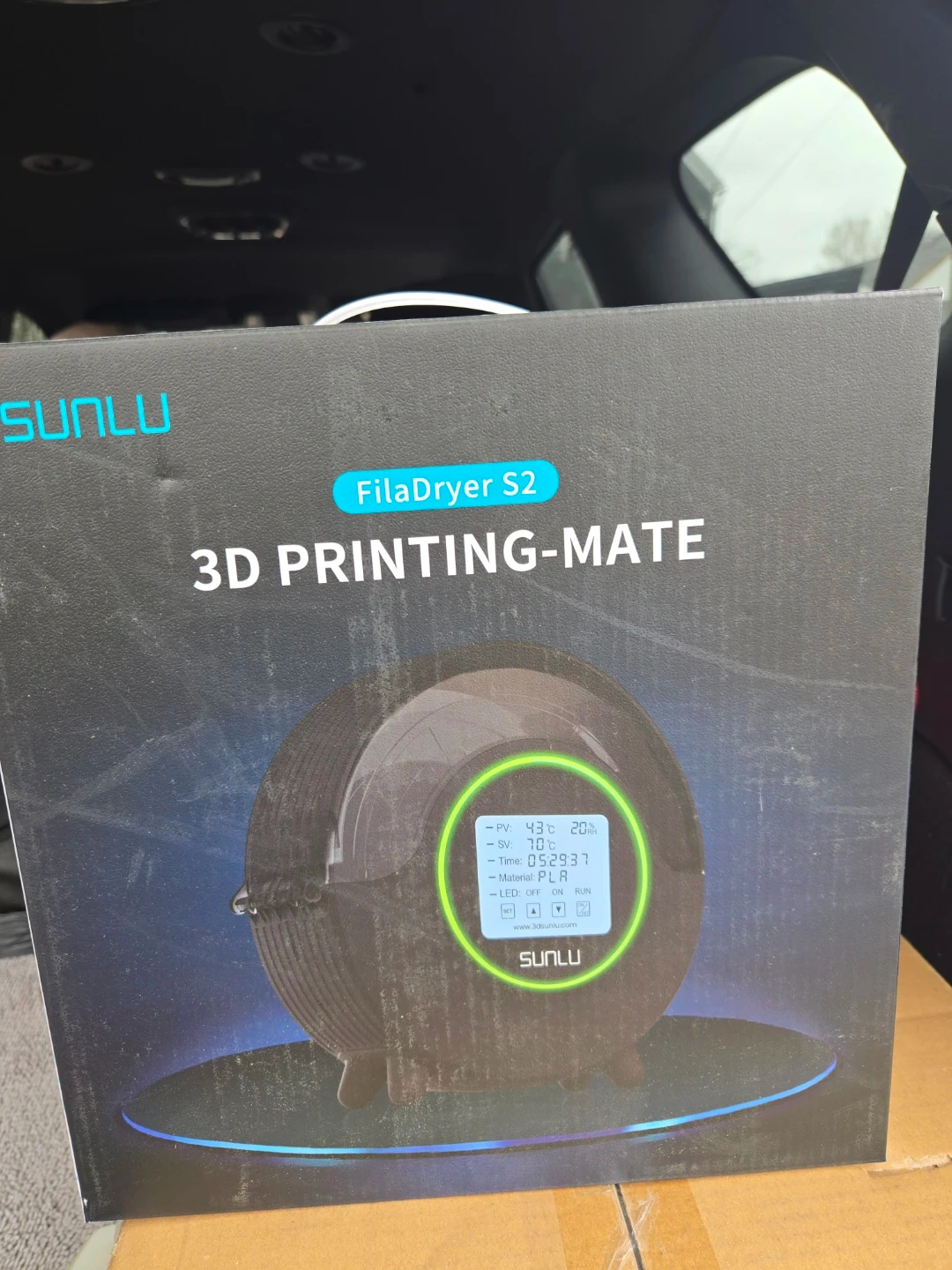 SUNLU FilaDryer S2 for 3D printing filaments. Features fast heating, time function, and convenient operation. Max working temperature 70°C, working humidity <90%.