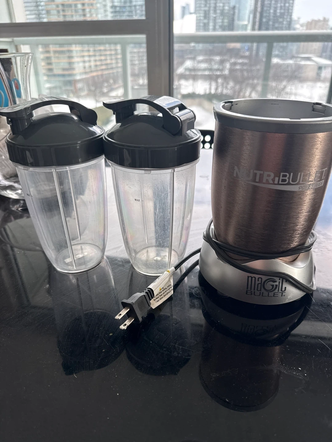 This NutriBullet Magic Bullet 960 Series blender comes with the motor base and two cups. It's a great appliance for making smoothies and shakes. The cups have lids with handles.
