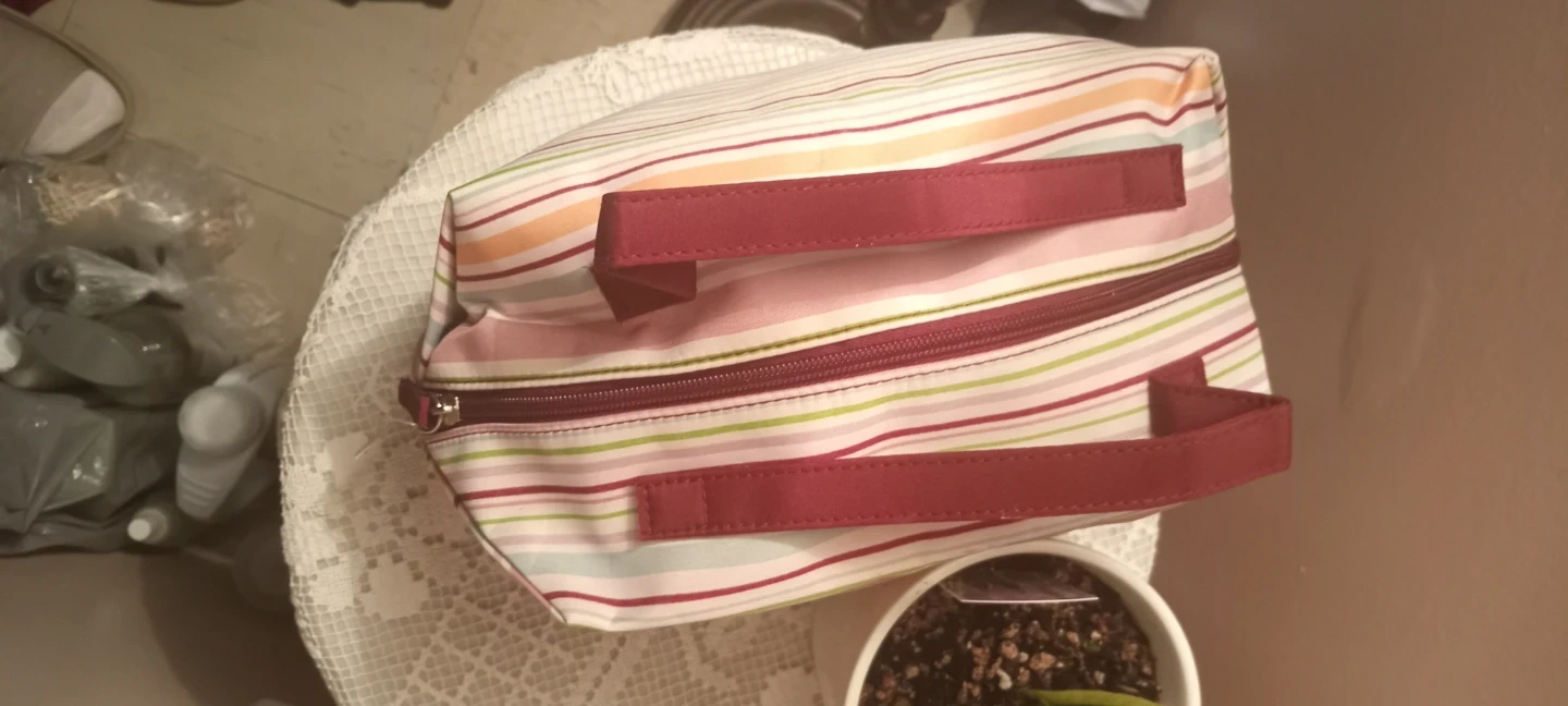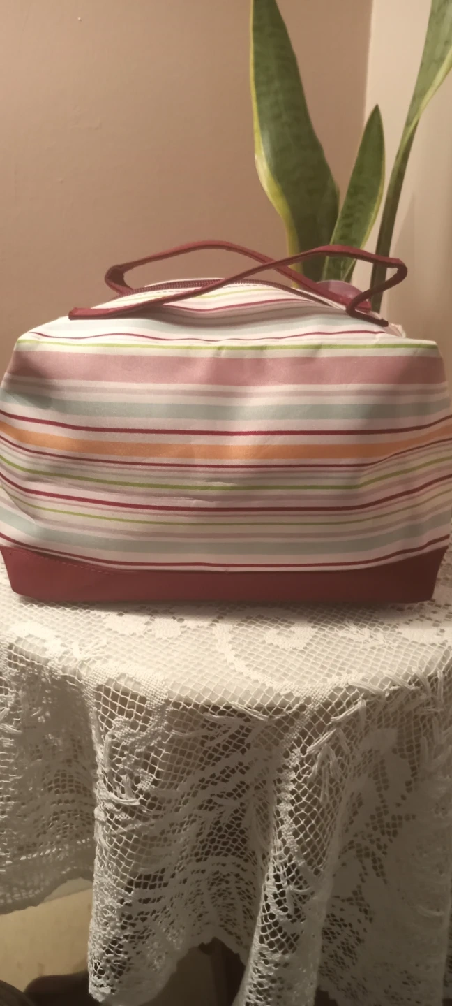 -STRIPPED cosmetic bag also folds. Size- 14" wide x 6" deep x 6 1/2 high - $5