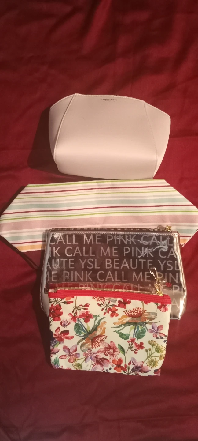 Set of four assorted cosmetic bags. Includes one pink zippered pouch with a Givenchy logo. Another bag features a colourful striped pattern, and a clear zippered pouch has text that reads 'CALL ME PINK . A small floral patterned pouch with a red zipper is also included.