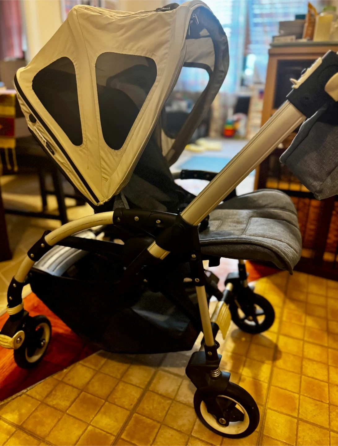 Color: Navy Blue Includes: Summer canopy + regular blue canopy Extras: Matching diaper bag + original Bugaboo footmuff (blue) Handle: Excellent condition Basket & seat: Clean Wheels: No issues, smooth ride Lightly used for only a couple of months before switching to another stroller Compact, stylish, and ready to use!