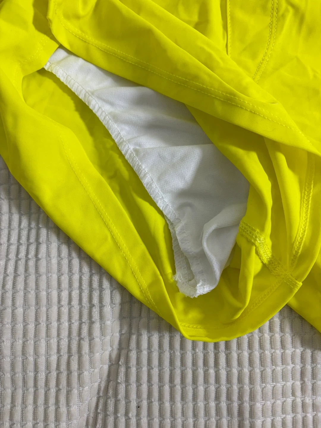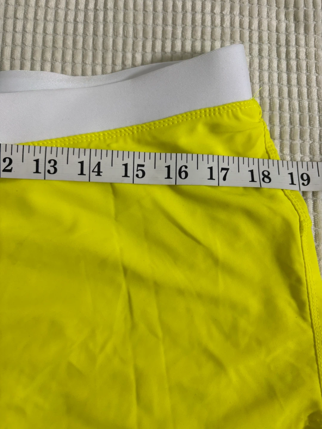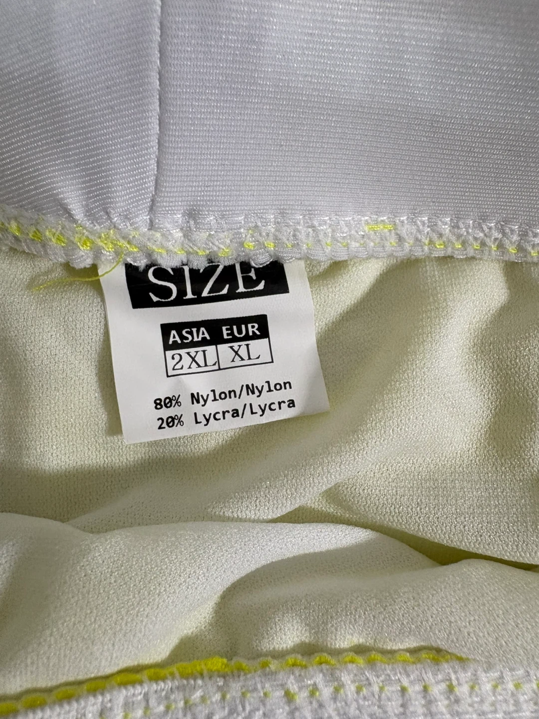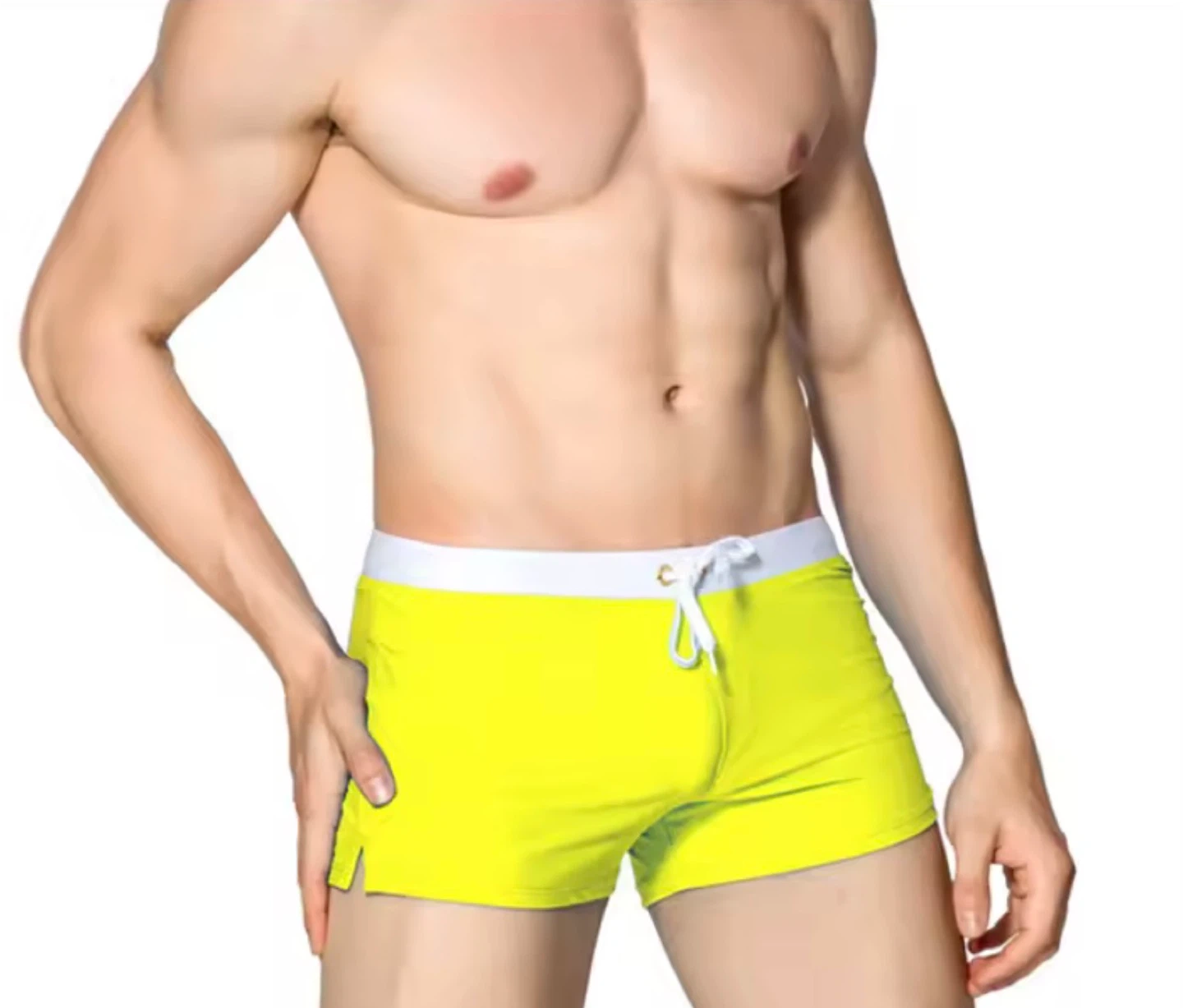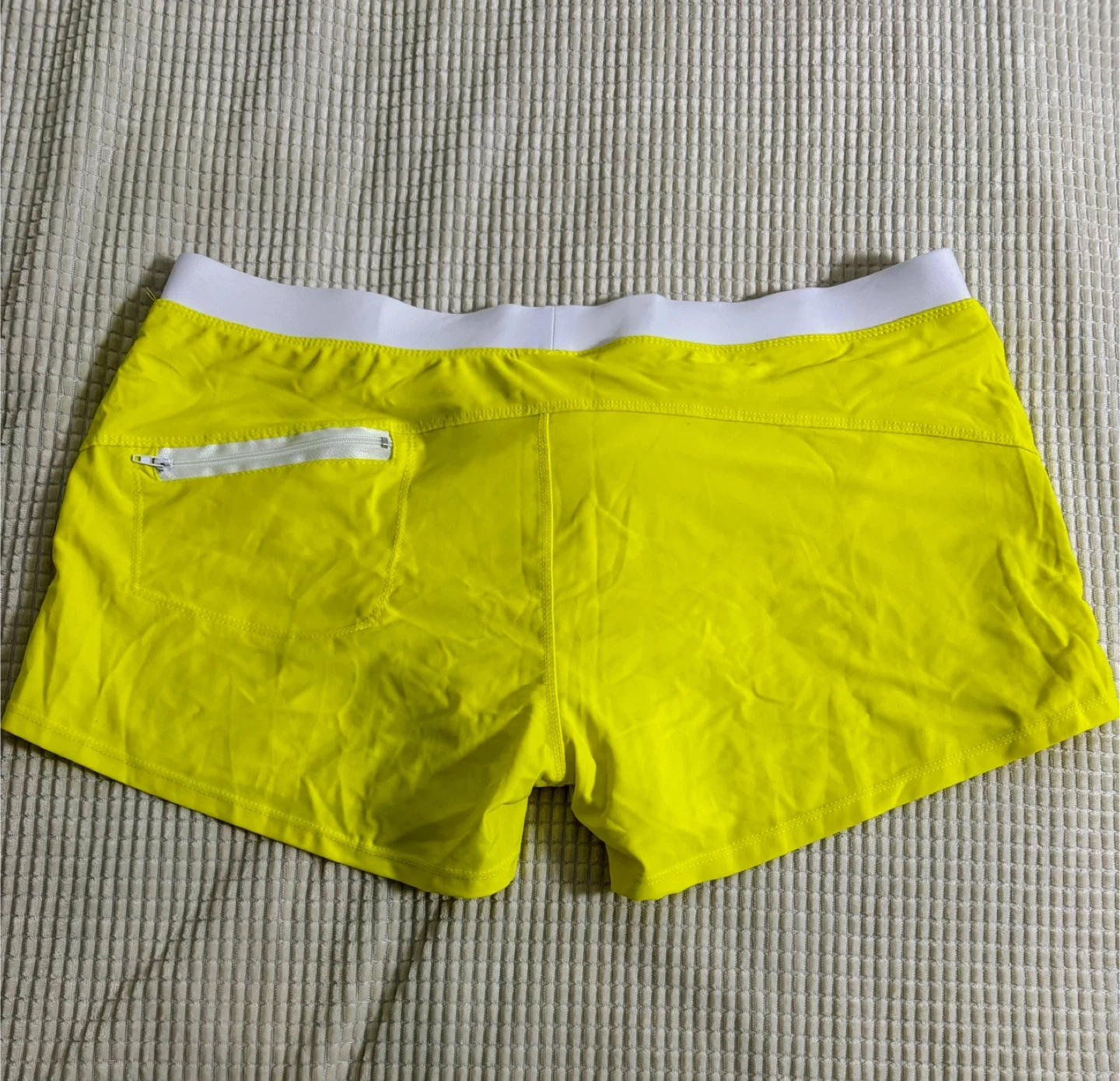Men's swim trunks in bright yellow. Features a white waistband and a zippered pocket on the back. Made with 80% Nylon and 20% Lycra for a comfortable fit. These shorts are a size XL