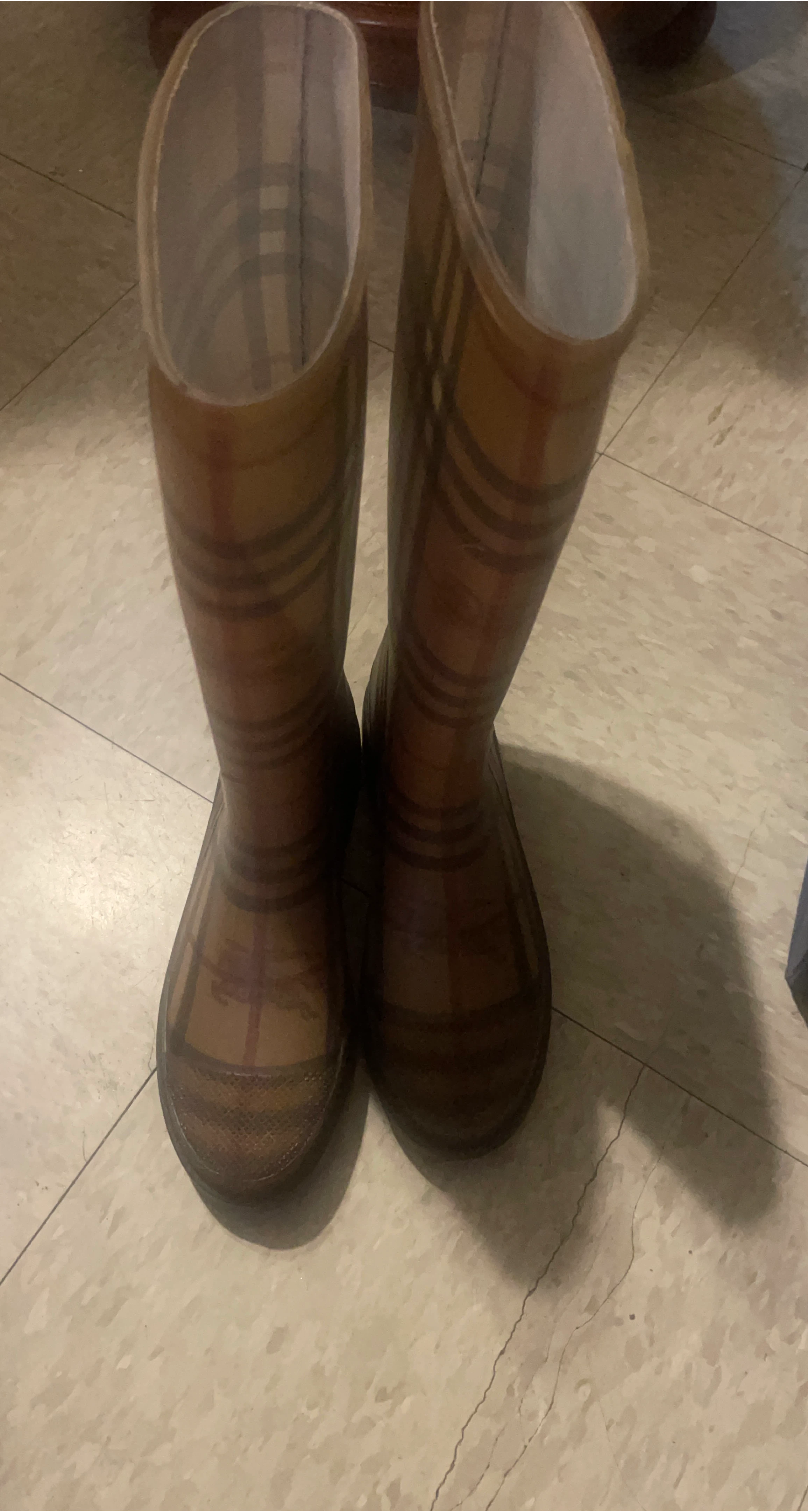 20Selling a pair of Burberry rain boots with the classic plaid pattern. They're in good condition and ready to keep your feet dry in style!