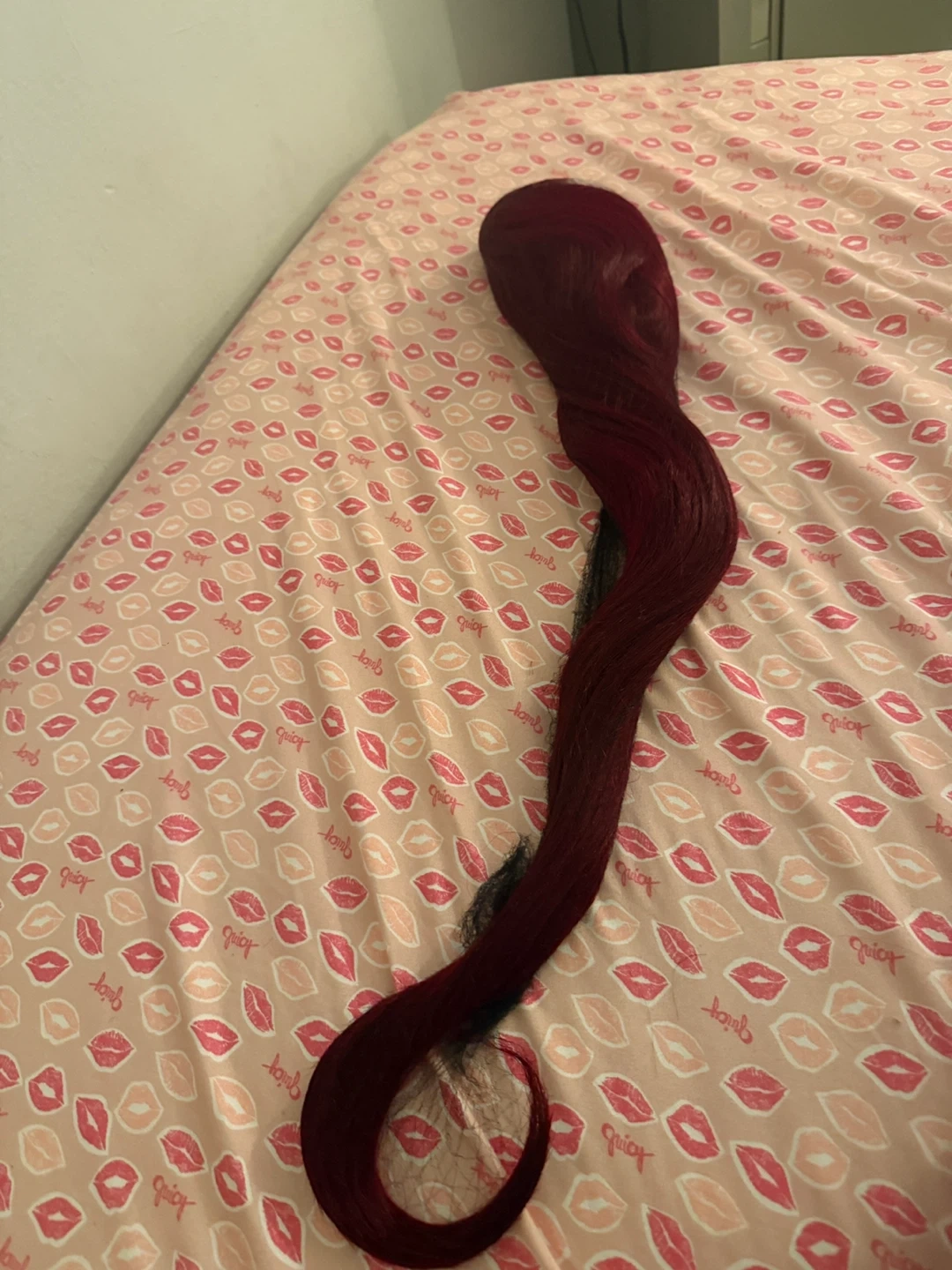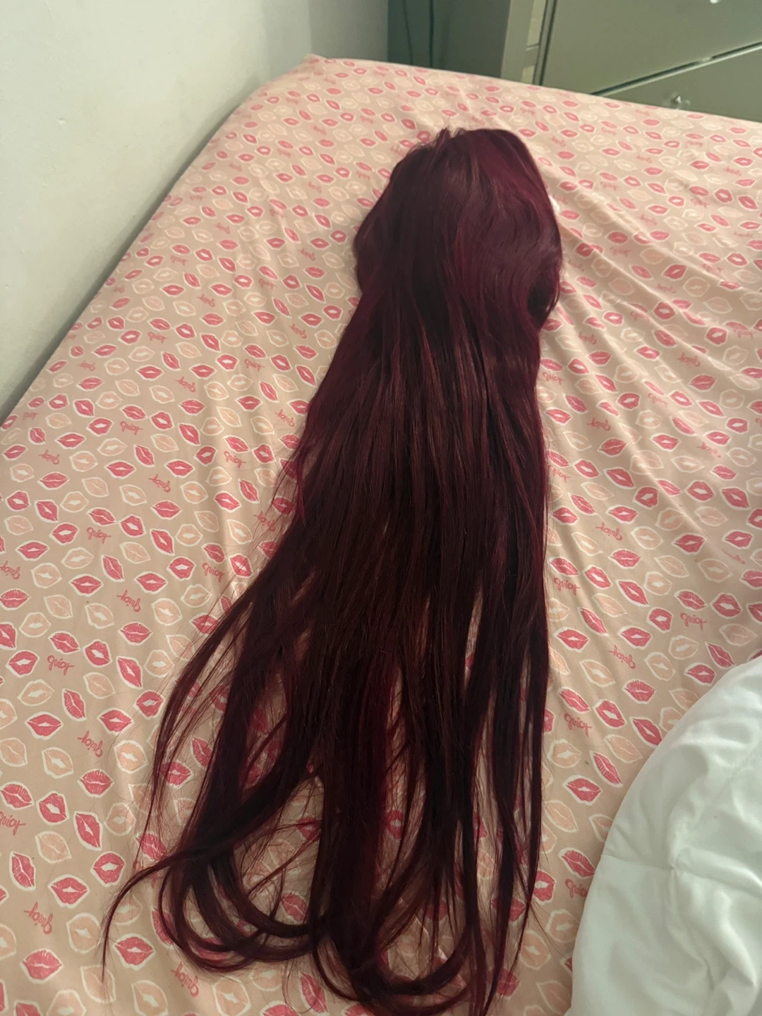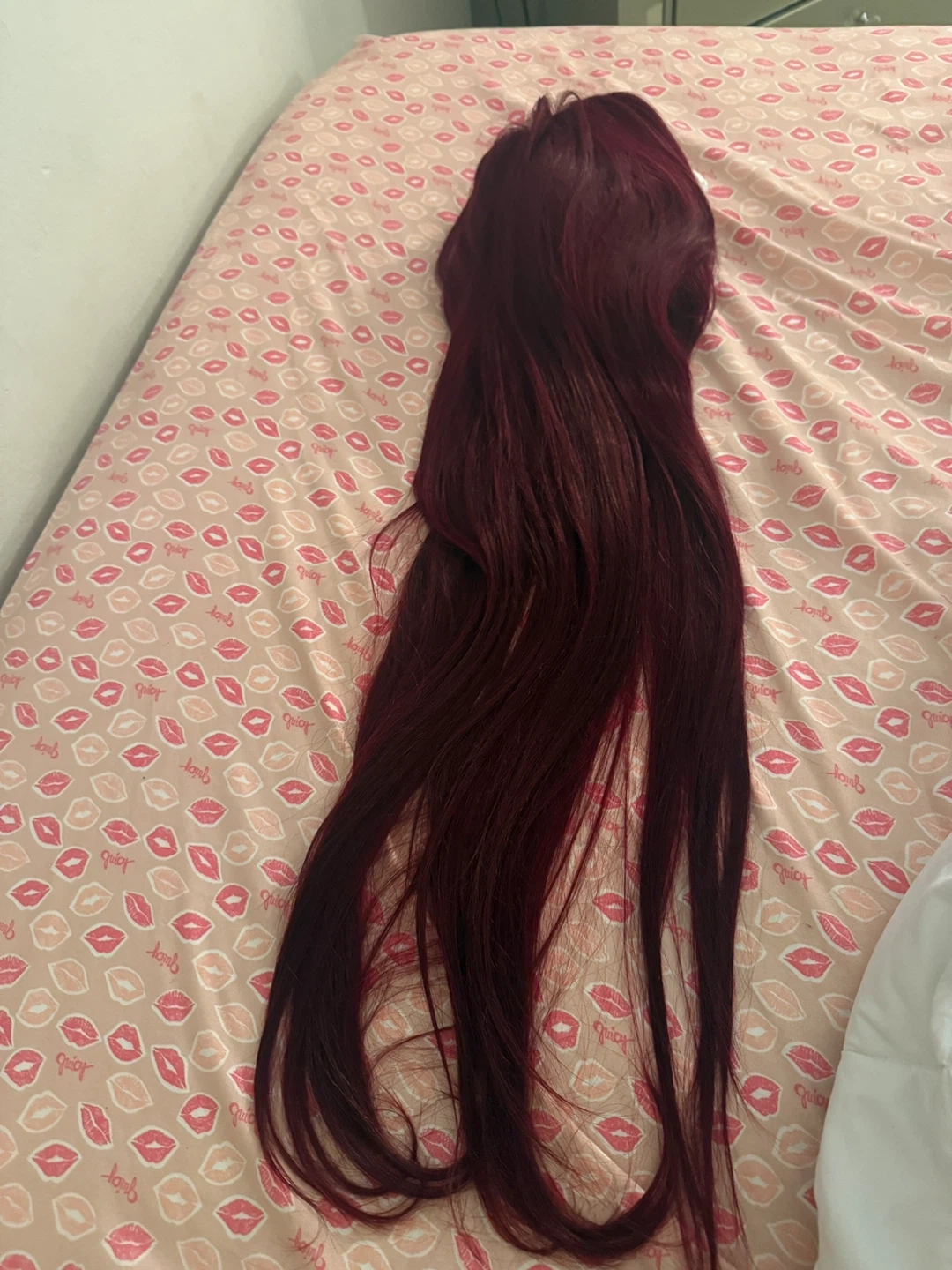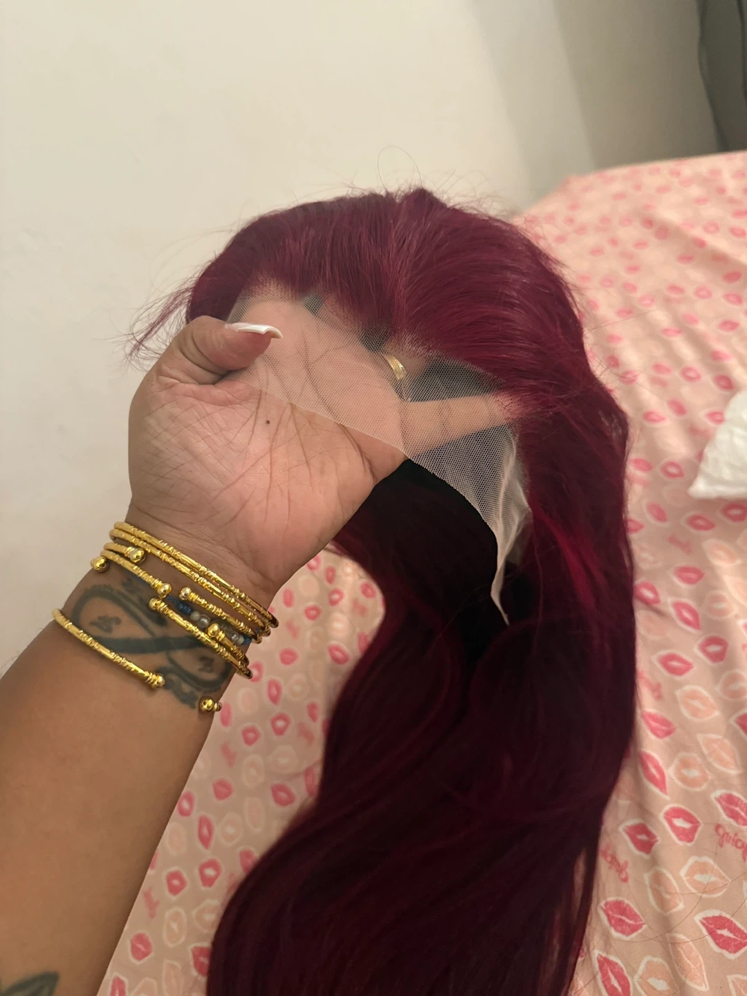 Selling a burgundy red wig. It appears to be in good condition and has long, wavy hair. Conditions new 13x4 34” inch human hair .