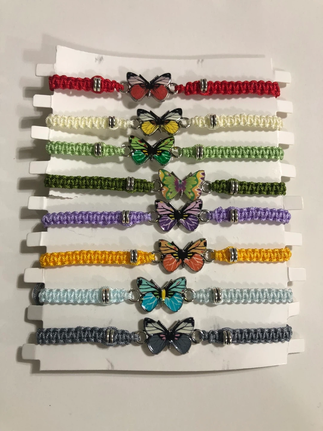 23I have several cute butterfly charm bracelets available in a variety of colors! They're perfect for adding a little fun to any outfit. Each bracelet features a colorful butterfly charm on a woven cord. Check out the photos to see all the available colors! 4$ each