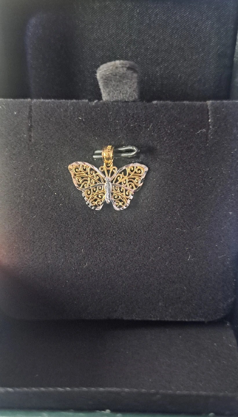 Beautiful butterfly pendant with intricate filigree design in gold 2 tone Comes in a presentation box!