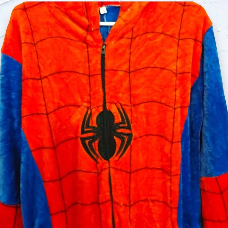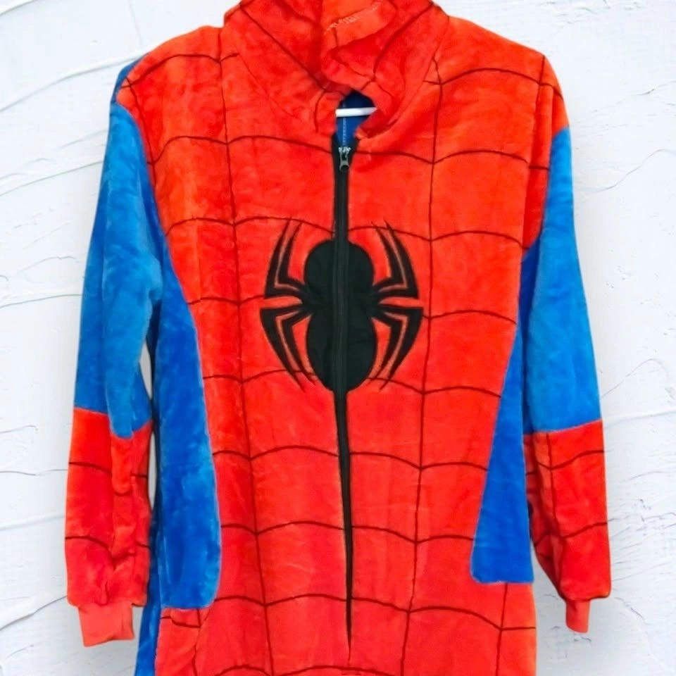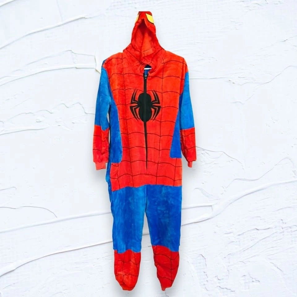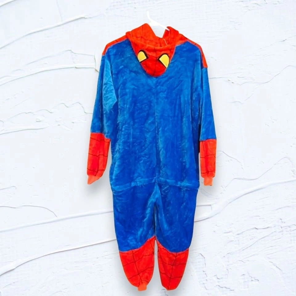 Super soft one piece union suit style hooded Spiderman pajama set/ costume. Size Adult Small. Cuffs at ankle and wrists. Front and horizontal rear zipper closure. Machine wash/line dry. This pre-owned item has been gently used with light wear from normal use. Smoke and pet free home.