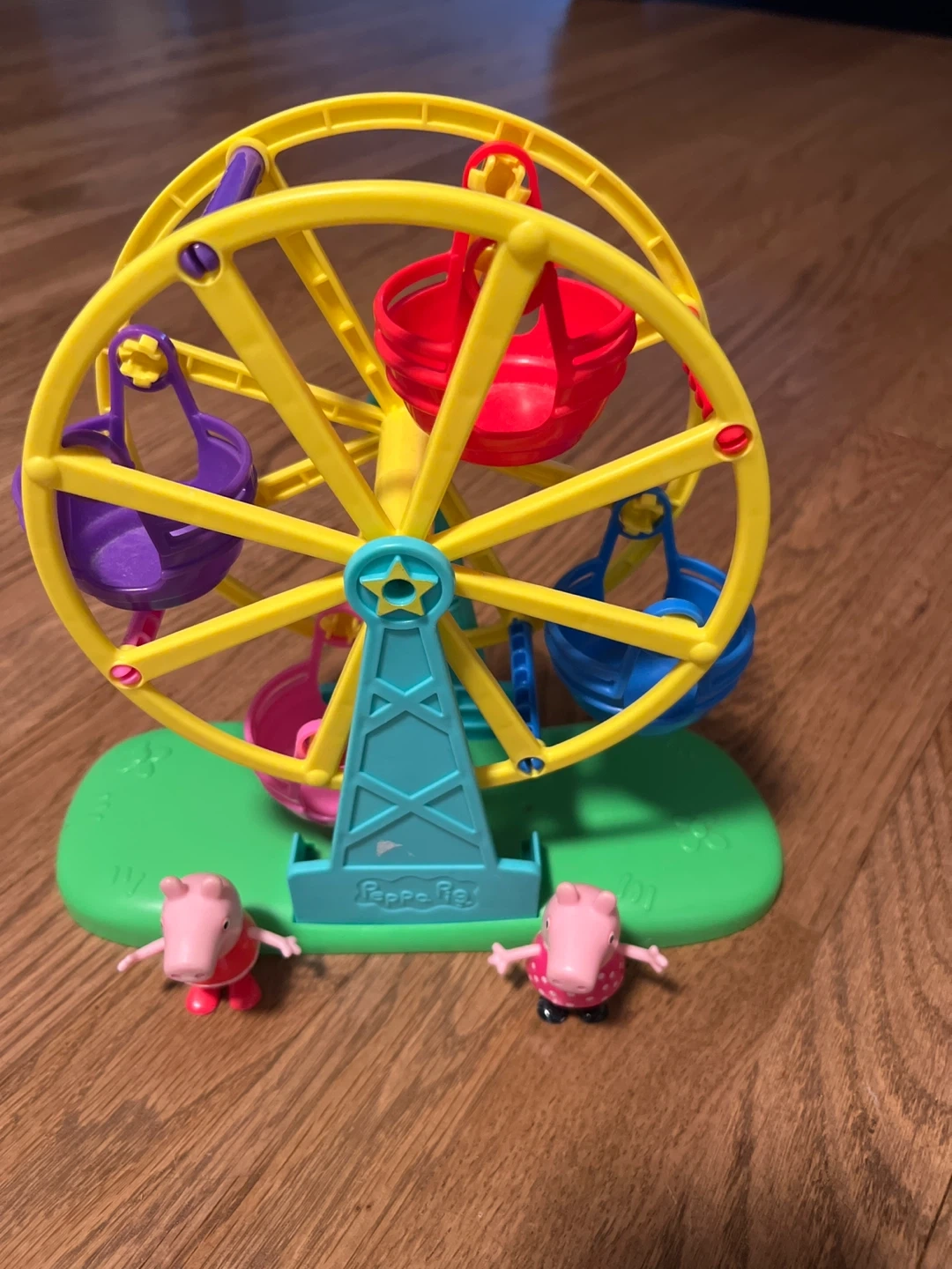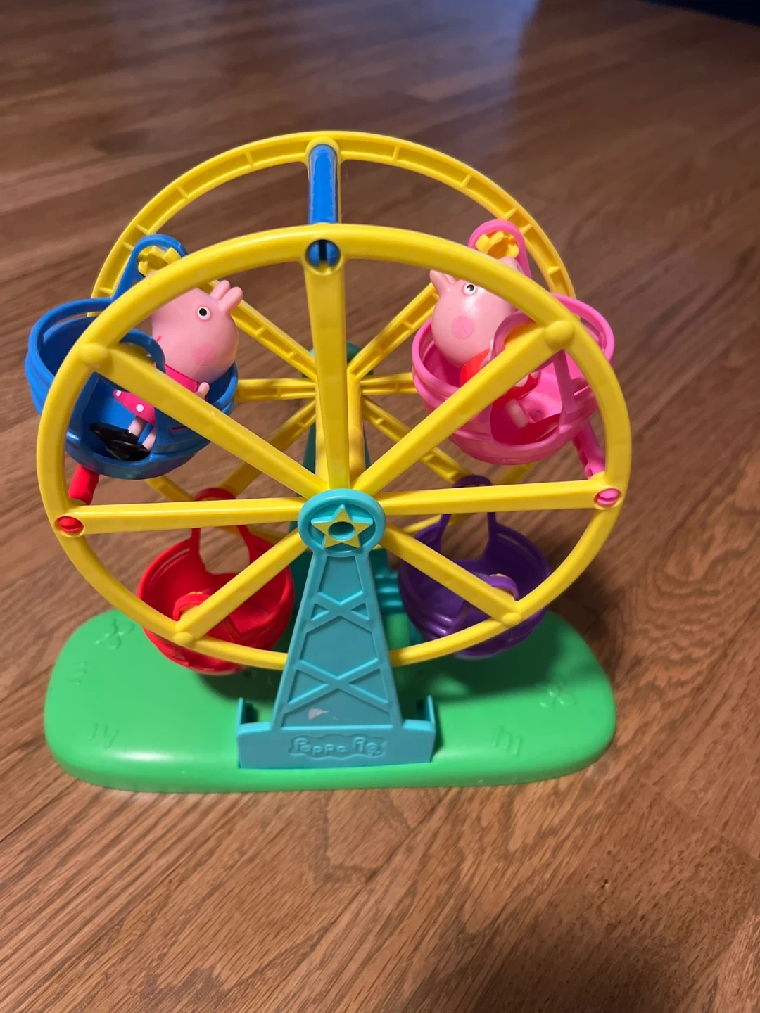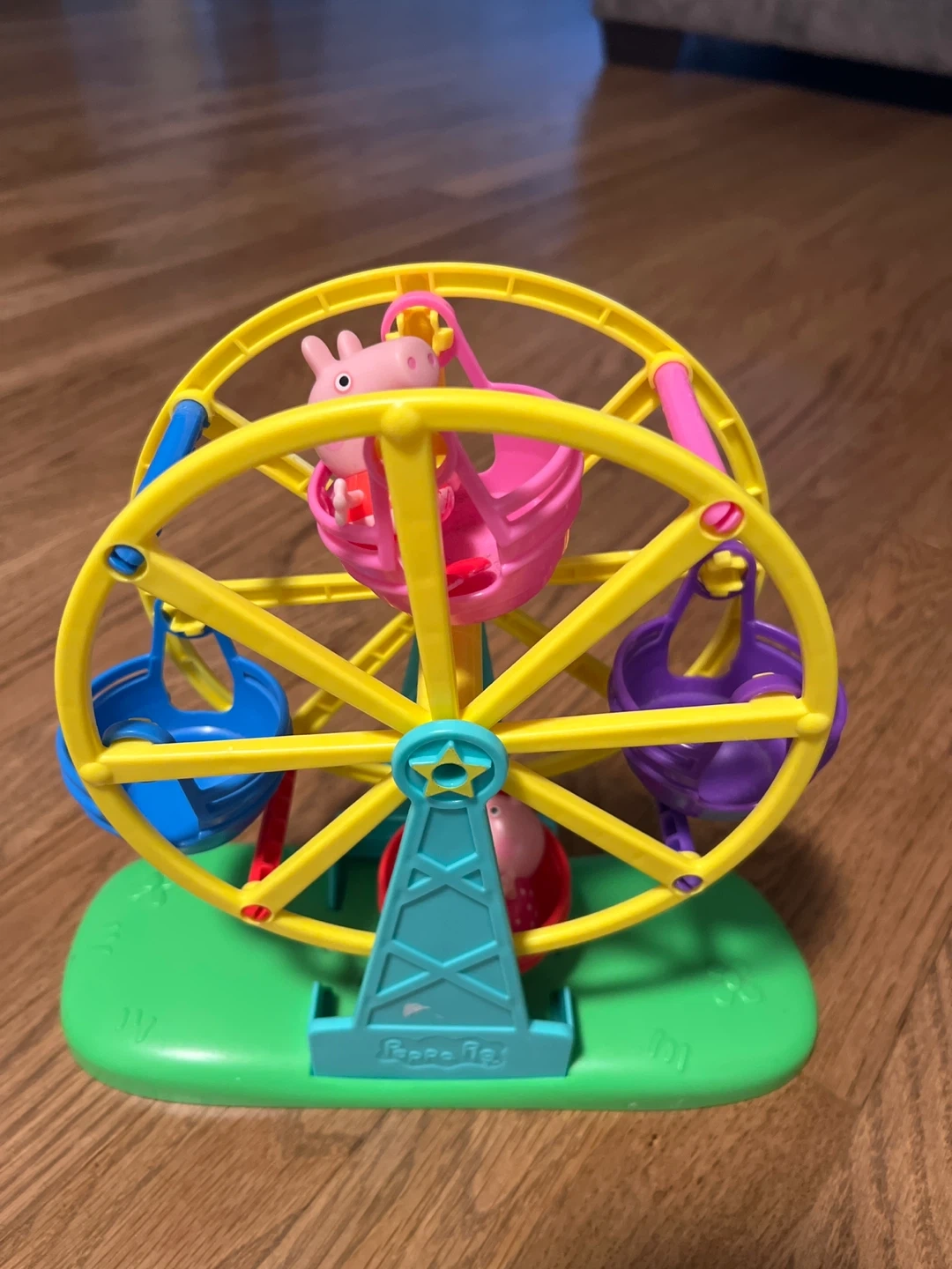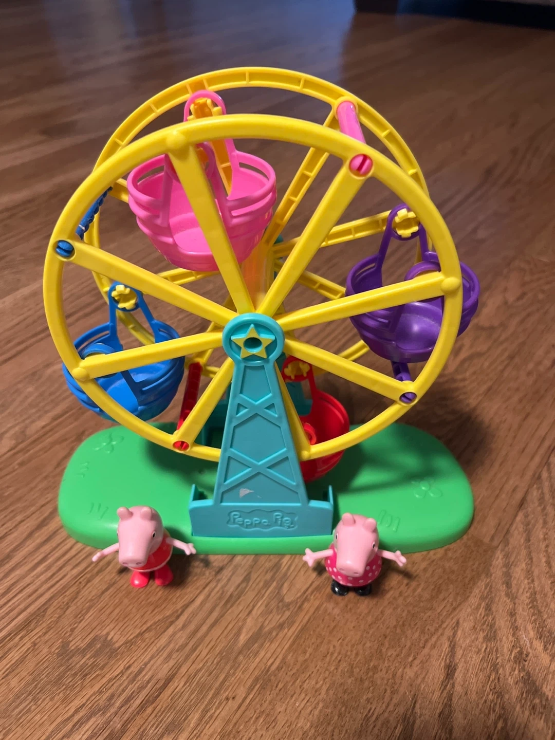 This Peppa Pig Ferris Wheel toy features colorful gondolas. It includes two Peppa Pig figures. Great for imaginative play!
