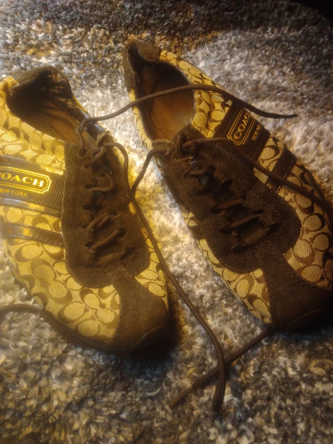 Coach sneakers in their signature monogram pattern. Features dark brown suede accents and laces. These are casual athletic shoes.