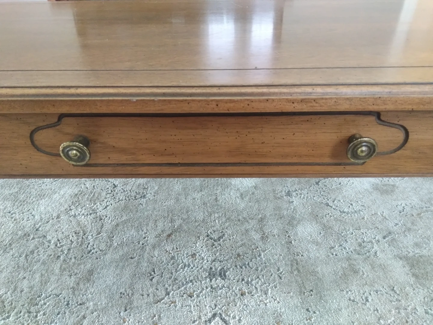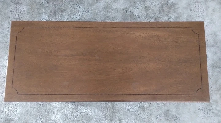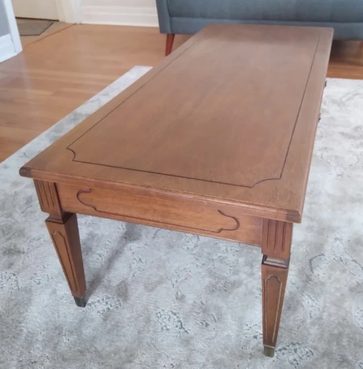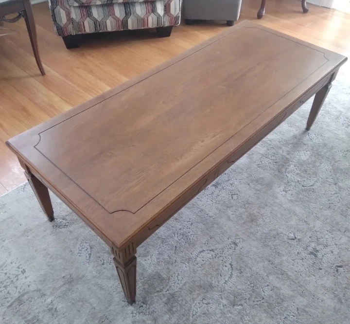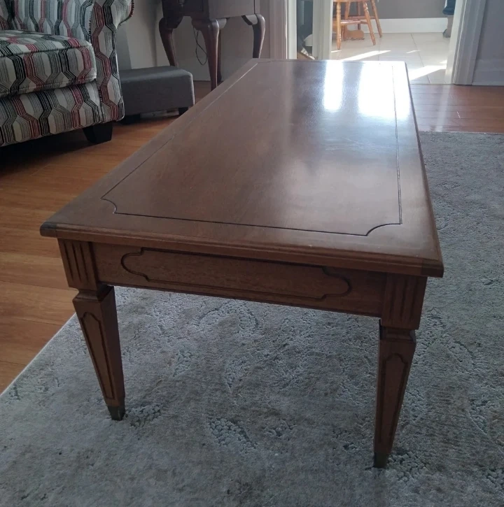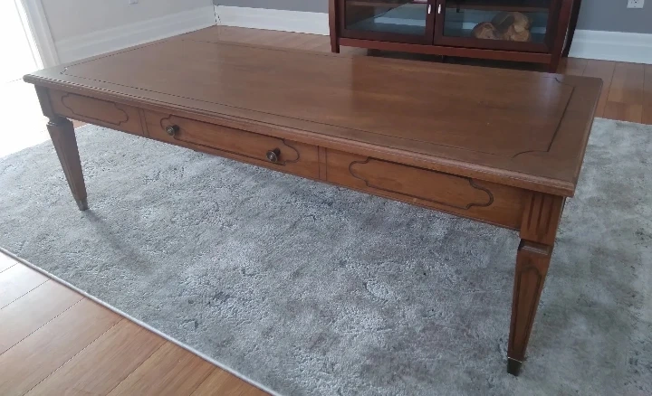 A lovely wooden coffee table with decorative trim on table top and legs with faux drawer. It's a nice size for a living room. Selling as I found a table that fits our space better. Few minor scratches otherwise in great shape.