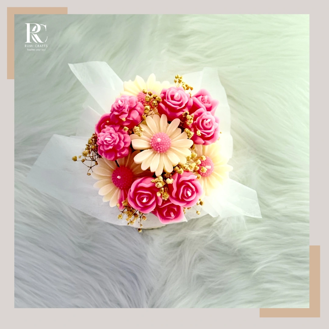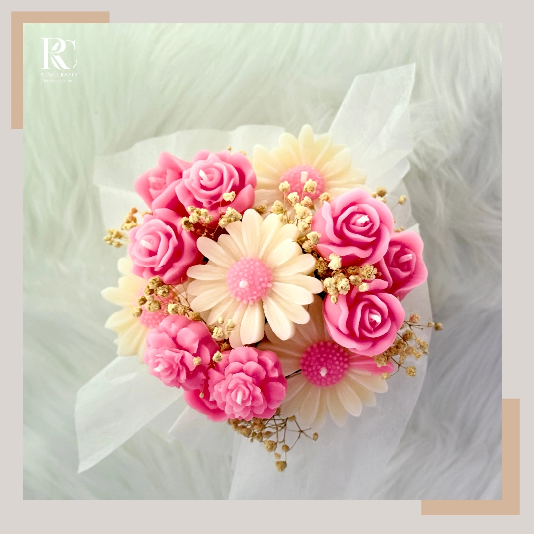 Selling a lovely flower candle bouquet from Rumi Crafts! This beautiful bouquet features pink roses and white daisy-like flowers, perfect for adding a touch of elegance to any room