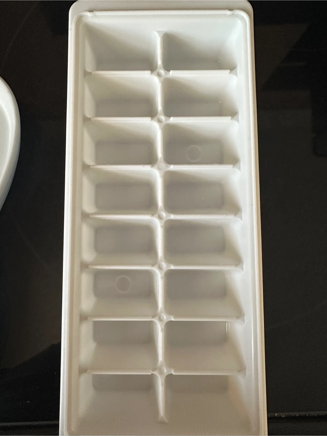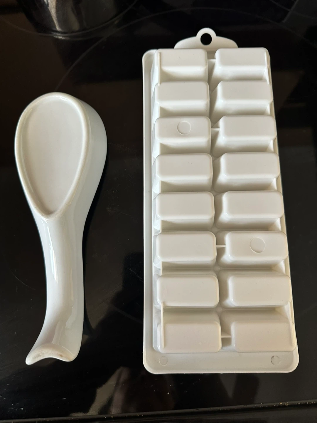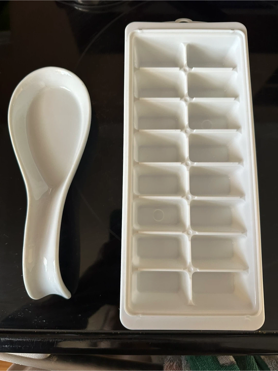 This set includes a white ceramic spoon rest and a plastic ice cube tray. The spoon rest is designed to hold utensils, keeping your counters clean. The ice cube tray makes 16 standard-sized cubes. Smoke free home.