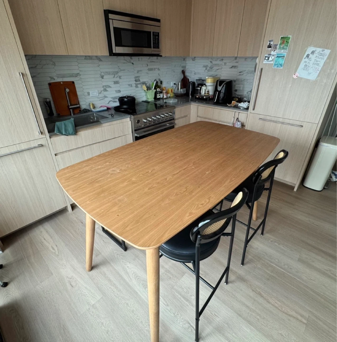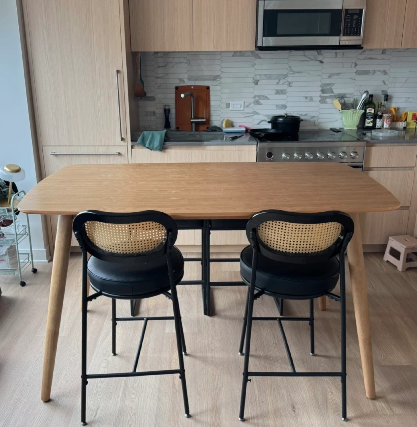 Counter-height oak wood table that can seat up to 6 people. It also works great as extra cooking space in the kitchen. Gently used and in a great condition. Pickup from boerum hill, BK