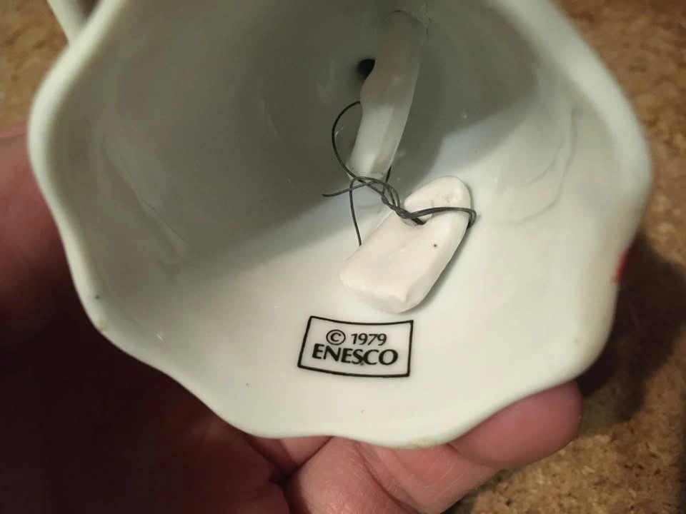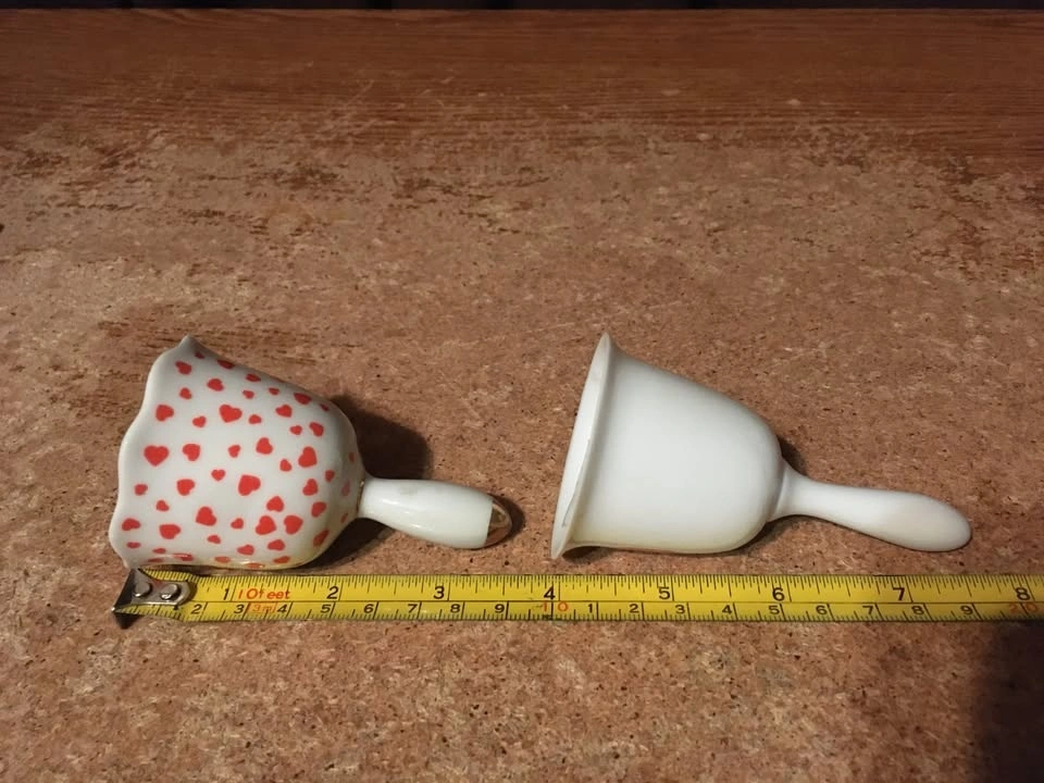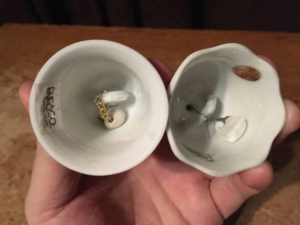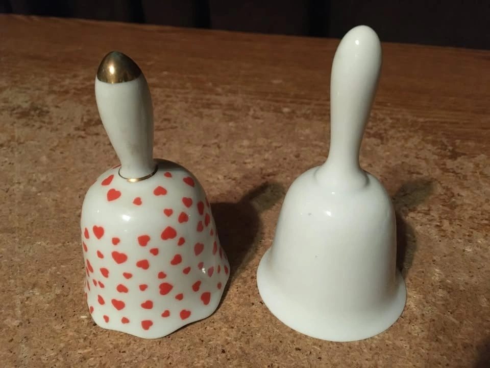 Pair of two Enesco table dinner bells. Includes a Valentine's Day hearts bell (1979) and a Halloween pumpkin jack o' lantern bell (1984). Both are in good condition with a little wear. Each is about 3.5 inches tall. Cash only.
