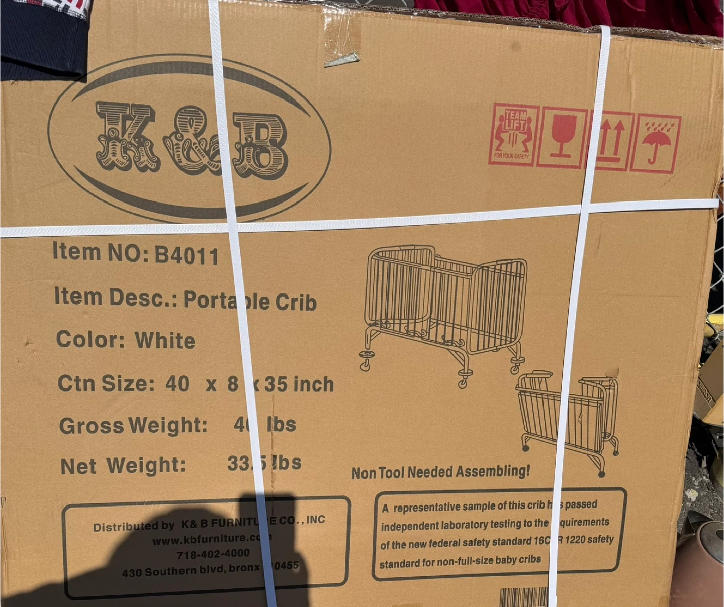 This is a K&B portable crib in white. It's non-tool needed assembling. The carton size is 40 x 8 x 35 inches. It has passed independent laboratory testing to the requirements of the new federal safety standard 16CFR 1220 safety standard for non-full-size baby cribs.
