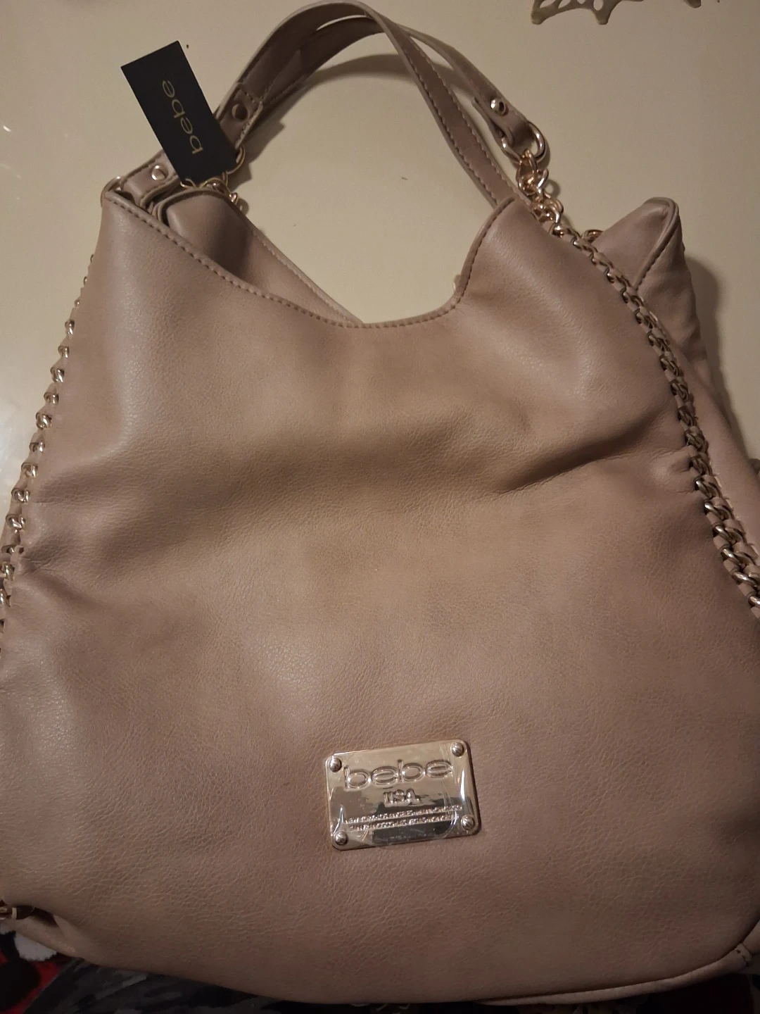This is a brand new bebe shoulder bag with tags still attached! It's a beautiful beige color and features a stylish chain detail. Perfect for everyday use or a night out
